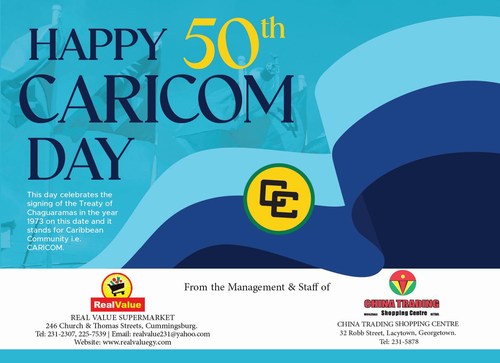 “I extend greetings to all the peoples of the Caribbean, as Guyana joins them in celebrating CARICOM Day today. This year, our Community is observing its Golden Jubilee, a milestone that attests to the relevance and sturdiness of our regional family, the Caribbean Community (CARICOM).