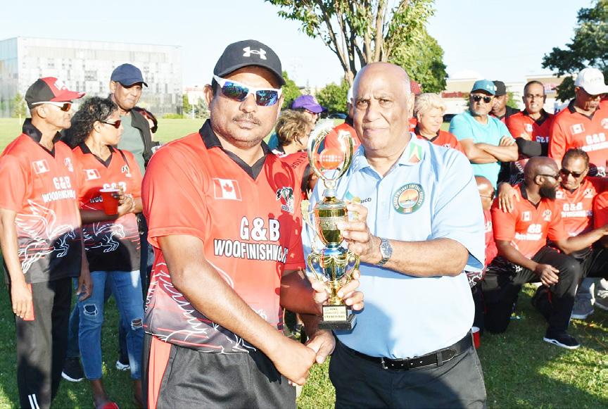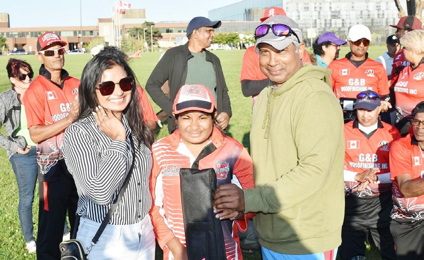 compliments of Norman Sue Bakery while Dhaniram was named the MVP, collecting a bat from Reshma Raman from Homelife/ Mapleleaf. He also received a trophy, donated by Trophy Stall, for registering a century. Malone collected a trophy for the “best” catch.