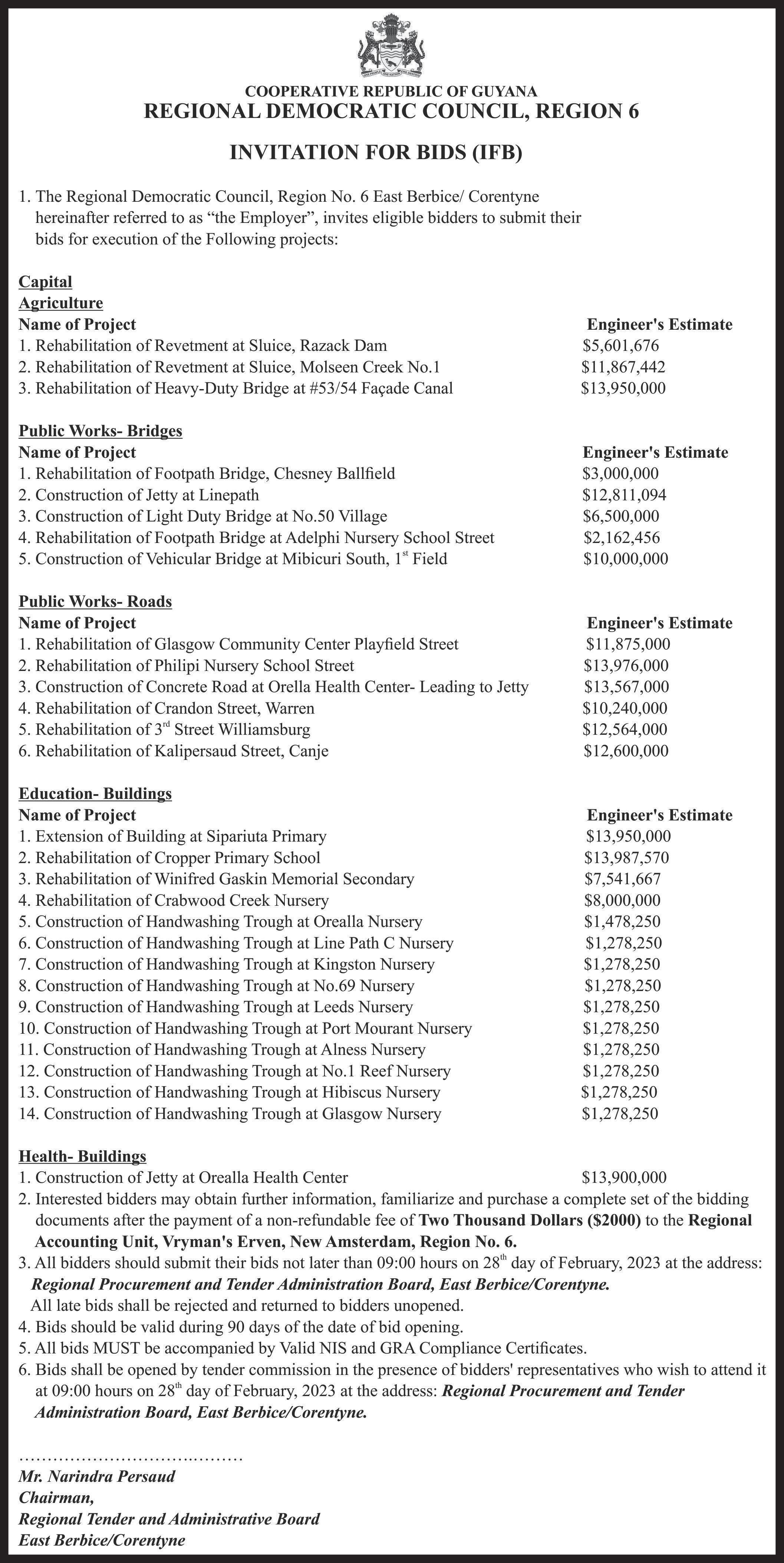 In the 2023 budget, over $79 million has been directly given to Region Six for agriculture initiatives, including the rehabilitation of bridges and revetments at Rotterdam , Nos . 62/63 and 53/54 façade, Razack Dam and Moleson Creek, and the purchase of tractor.
