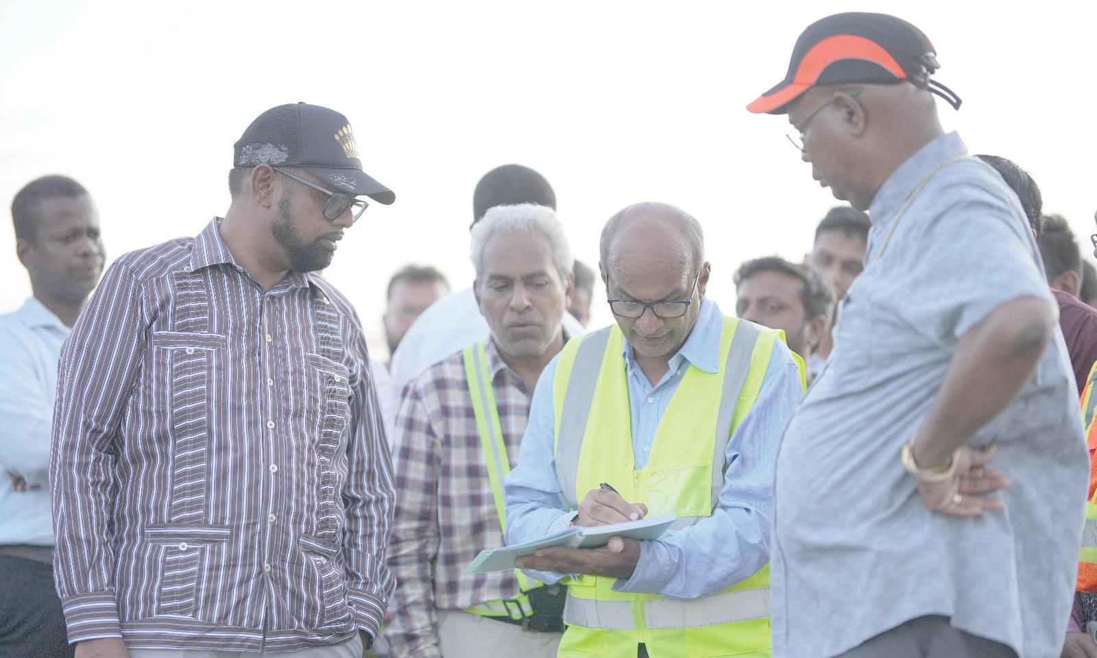 His Excellency President Dr Irfaan Ali inspected the progress of the new Ogle to Eccles four-lane highway on Tuesday afternoon. During the inspection, President Ali also engaged officials from Ashoka Buildcon Limited (the contractors) and from RITES Limited (the consultants). The President discussed the drainage system servicing the highway and the surrounding areas and improvements that will enhance the flow of traffic. When completed, the highway will provide a critical link between the East Coast and the East Bank of Demerara, which will significantly reduce traffic congestion along the two corridors and in the city. Minister of Public Works, the Honourable Bishop Juan Edghill and other Government officials were also present (OP photos)