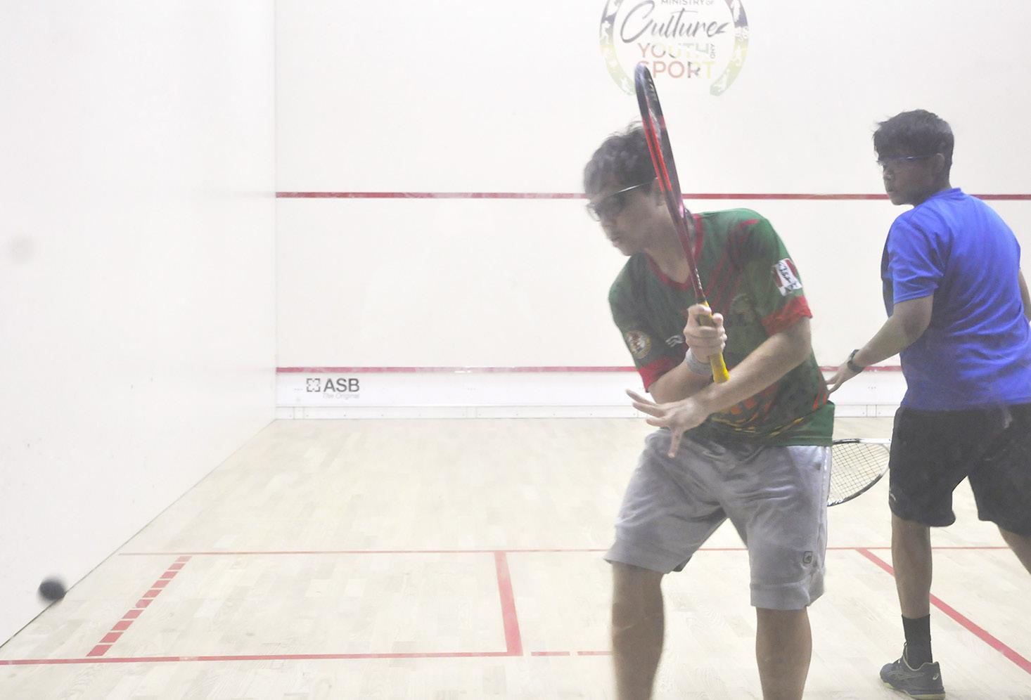 Brenno Da Silva (left) plays off the glass to beat Egan Bulkan 9-11, 11-5, 11-5, 12-10 on Wednesday night at the NRC
