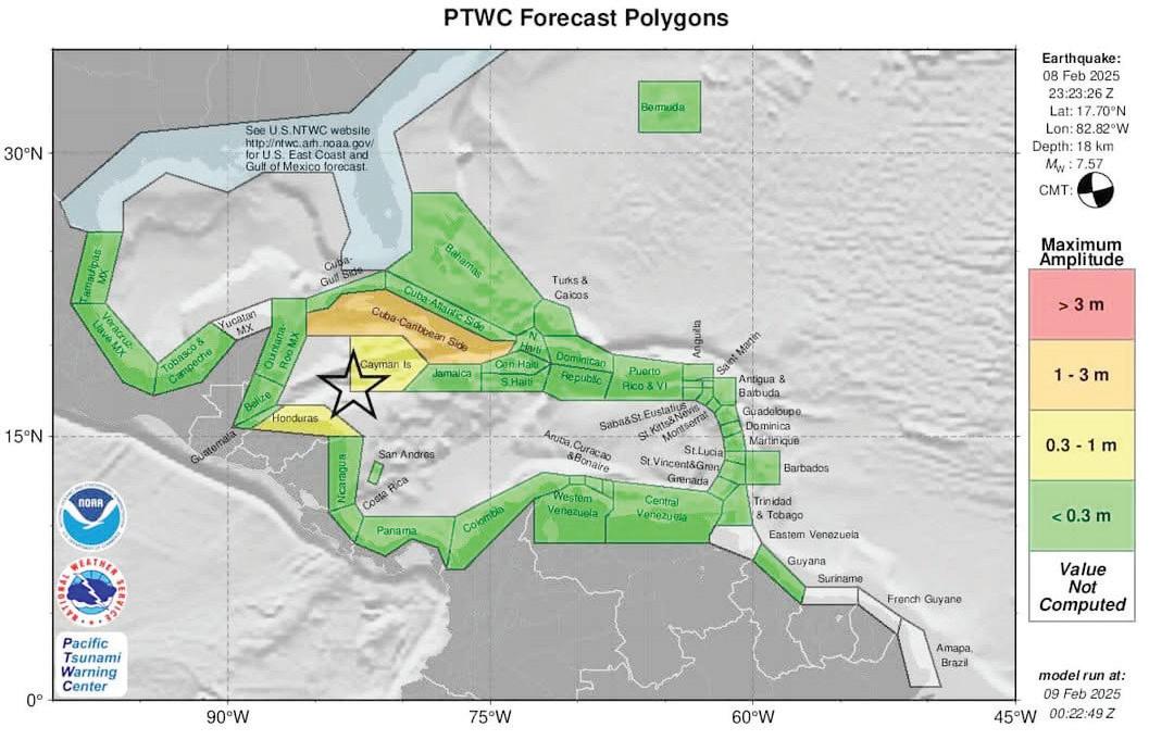 While the U.S. National Tsunami Warning Center initially issued tsunami watches for Puerto Rico and the Cayman Islands, these have since been cancelled. Though Guyana is at low
