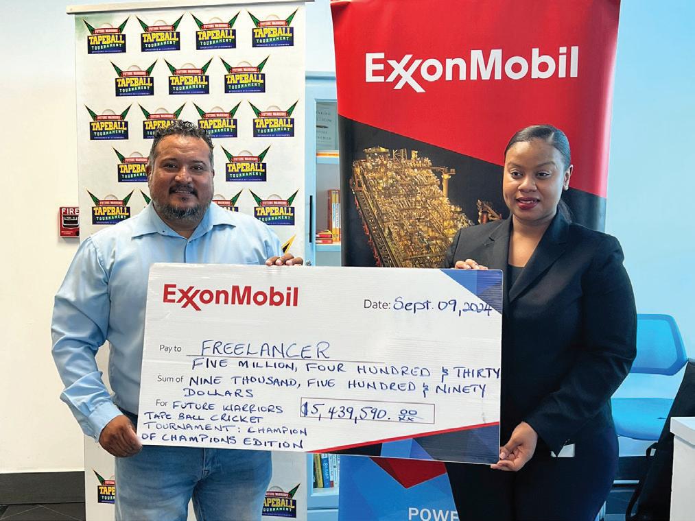 FL Sport’s John Ramsingh (left) collects the ceremonial sponsorship cheque from Community Relations Adviser for ExxonMobil Guyana, Lasawhna Prescott