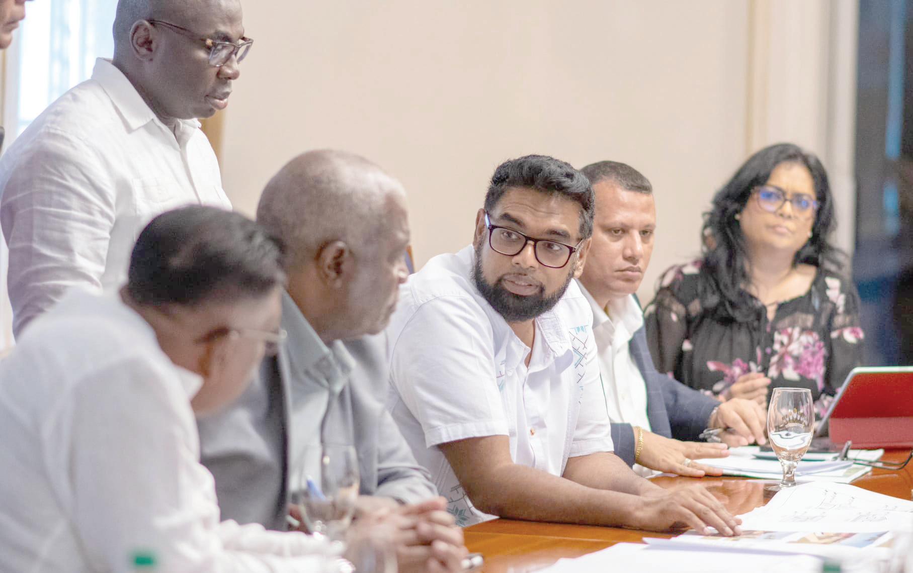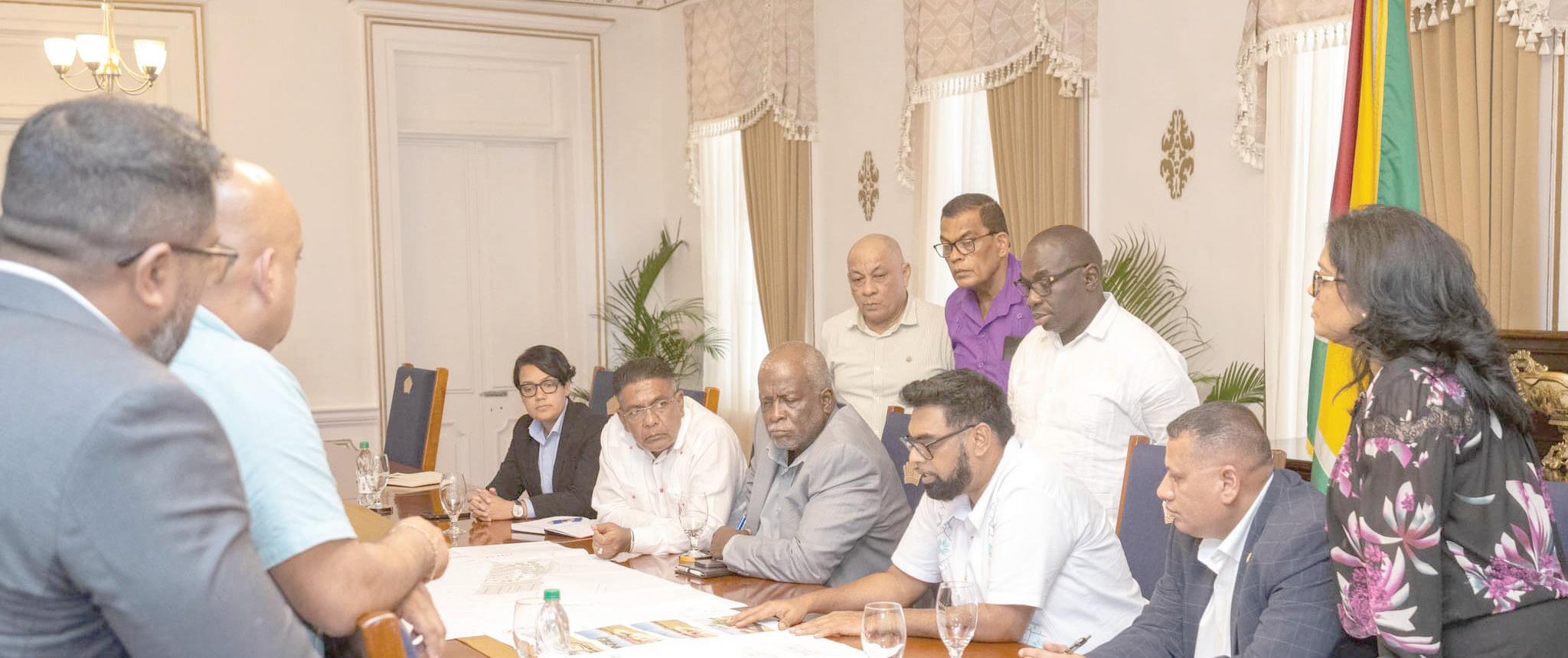 President, Dr. Irfaan Ali, on Monday, unveiled the masterplan for the homestead programme on the Soesdyke-Linden Highway. The project, which aims to empower single mothers, will commence shortly. It includes the construction of 500 houses on some 100 acres of land at Yarrowkabra. Prime Minister, Brigadier (Ret’d), Mark Phillips; other members of the Cabinet; technical officials and officials from the banking sector were also at the meeting (Office of the President photo)