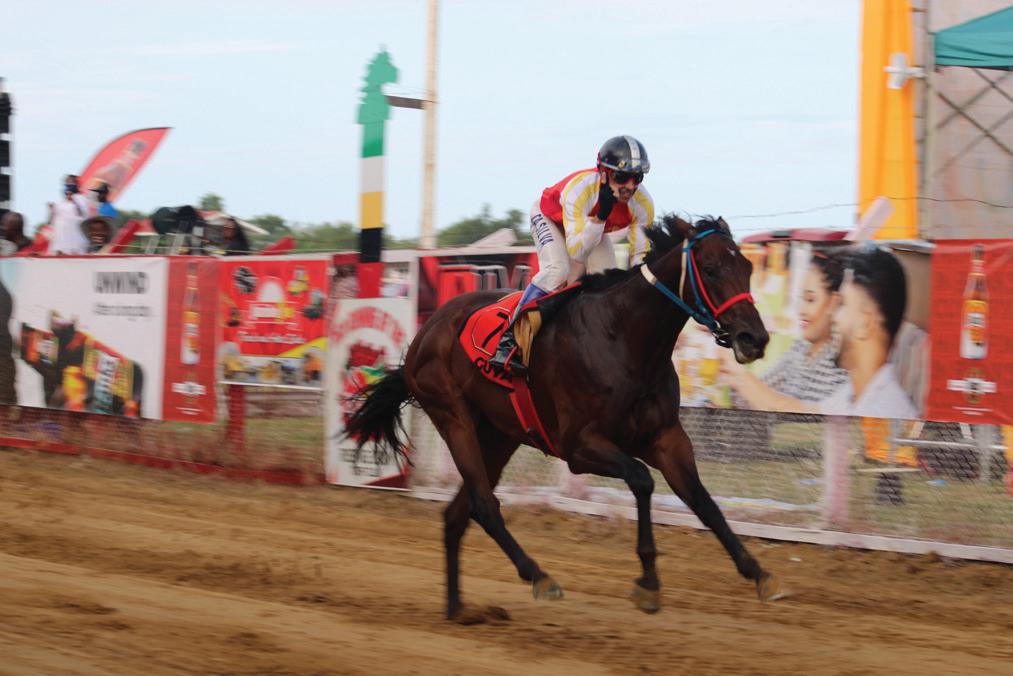 Olympic Kremlin who arrived in Guyana on Wednesday last, found the perfect timing to move into top gear and defeated a talented field of 10 horses, which included defending champion, Easy Time, which rode third. Nova Sol, a newly imported horse, finished second while Oy Vey ran fourth in a thrilling feature race.