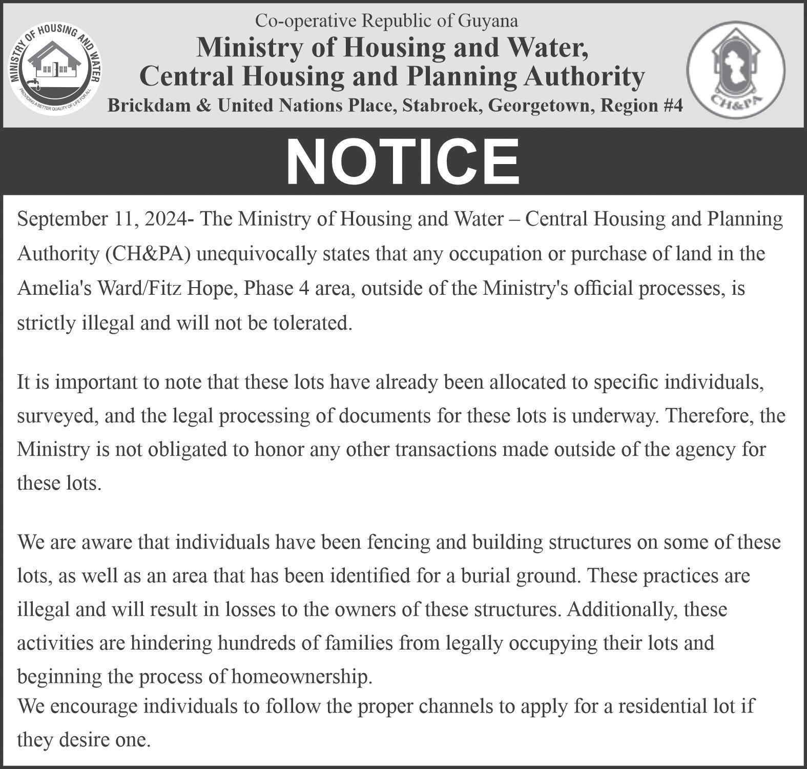 DURING a visit to Phase Four Amelia’s Ward/Fitz Hope, Linden, Chief Executive Officer (CEO) of the Central Housing and Planning Authority, Sherwyn Greaves reiterated a firm stance against squatting in the area.