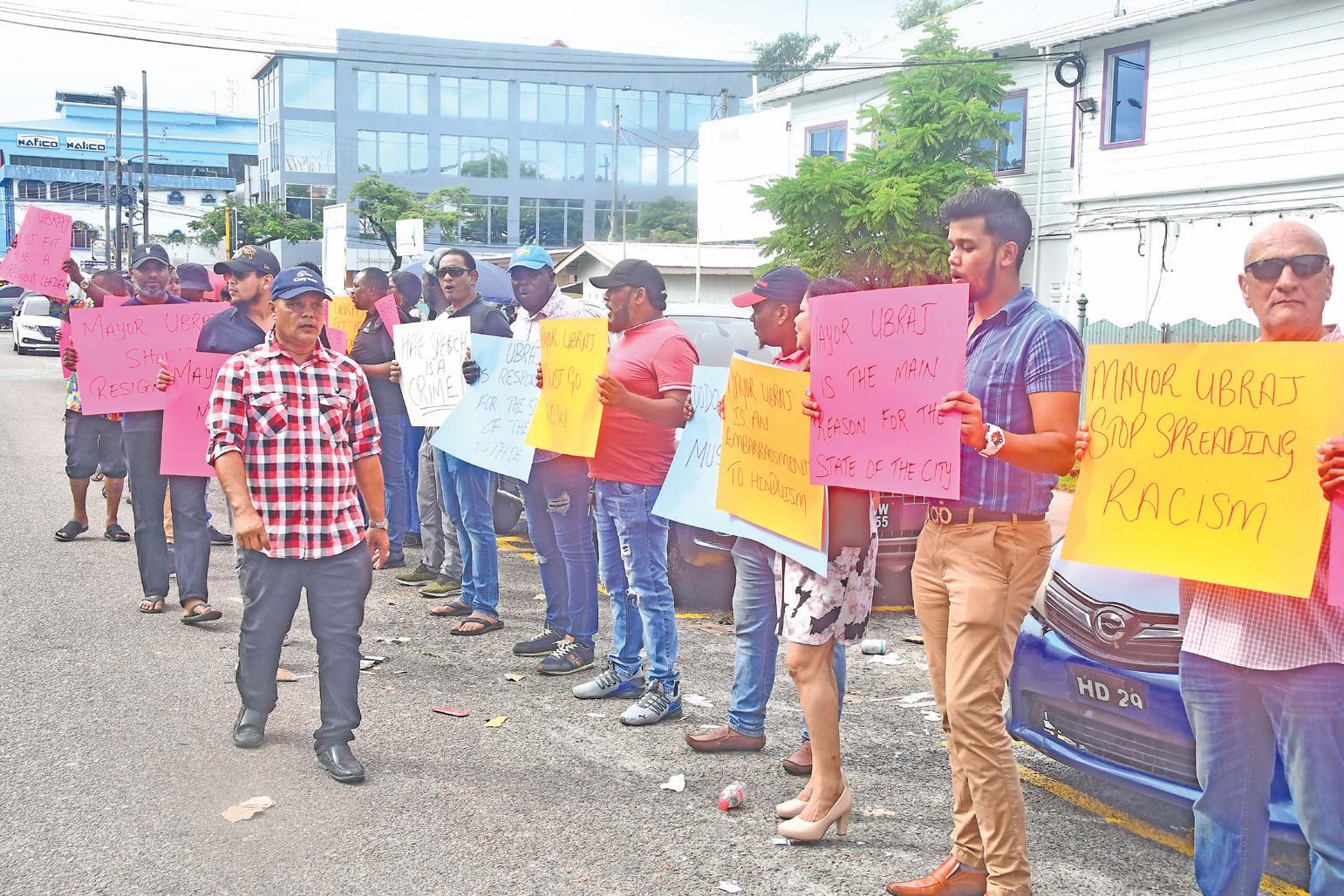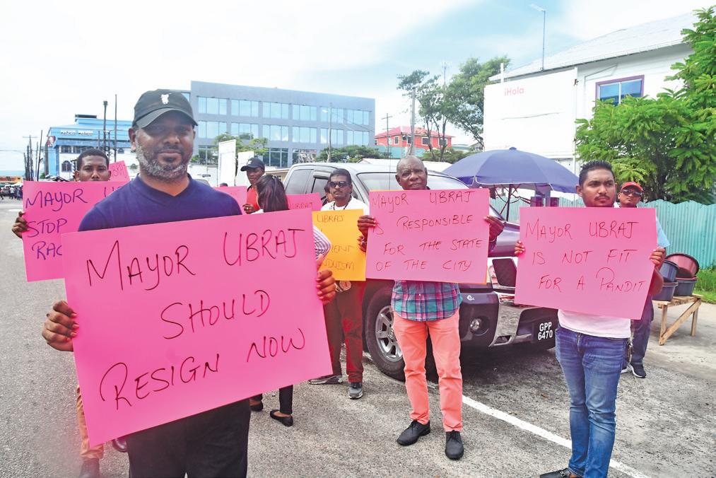 PROTESTORS chanted loudly, “the mayor must go,” during an expression of dissatisfaction and disgust with the Georgetown Mayor, Ubraj Narine’s attempts to promote racial and religious hostility among citizens.