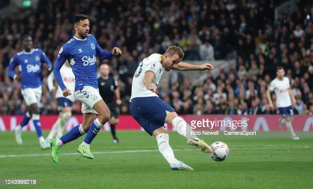 Tottenham Hotspur’s Harry Kane with a second half shot during the Premier League match between Tottenham Hotspur and Everton FC at Tottenham Hotspur Stadium on October 15, 2022 in London, United Kingdom. (Photo by Rob Newell - CameraSport via Getty Images) (BBC) - Harry Kane marked his 400th Tot tenham appearance with the opening goal as Antonio Conte’s side closed the gap on Pre mier League leaders