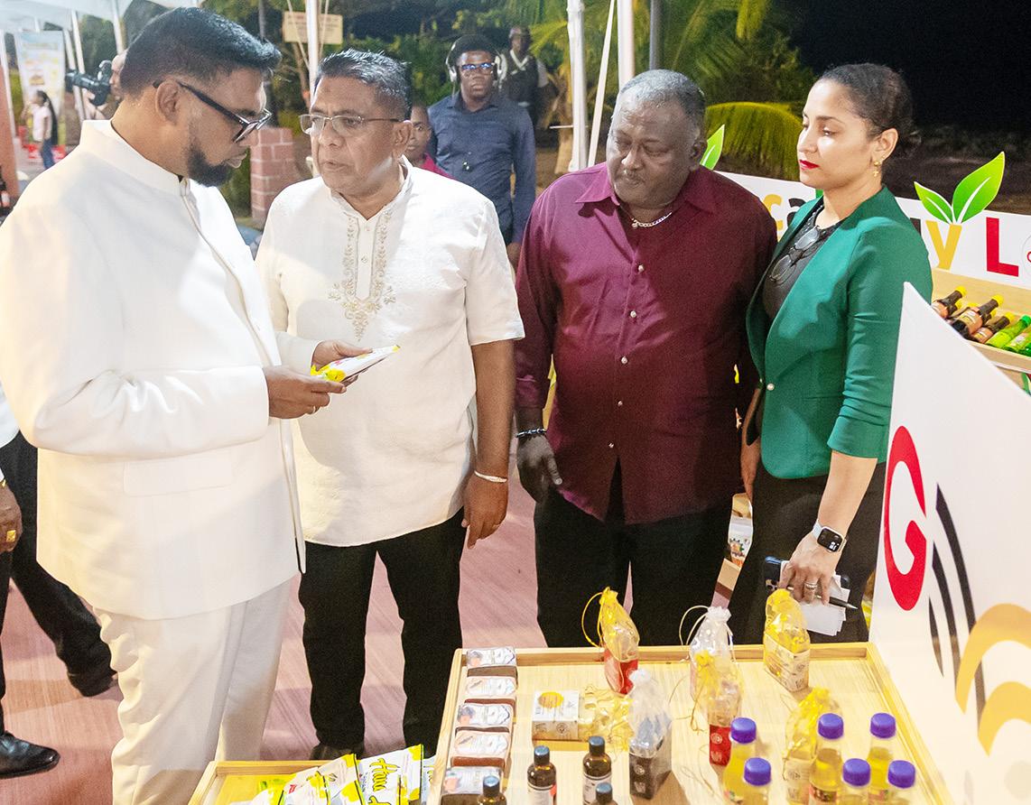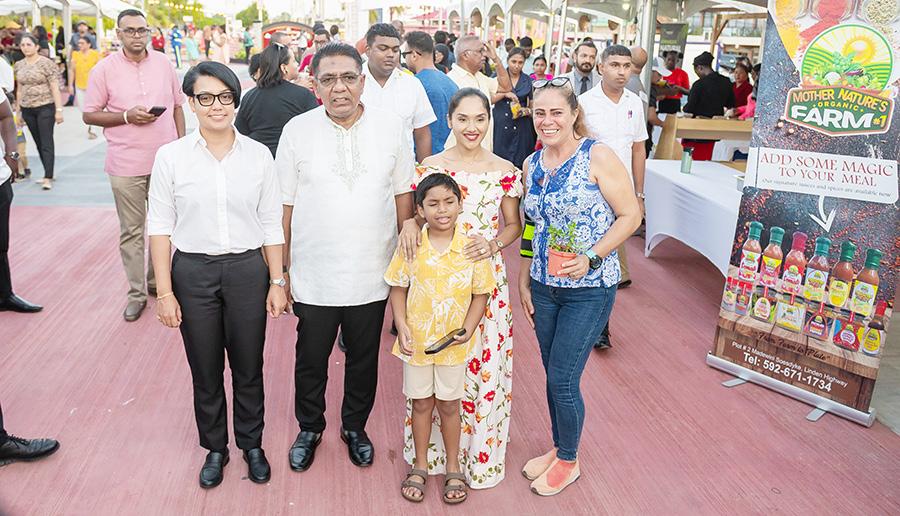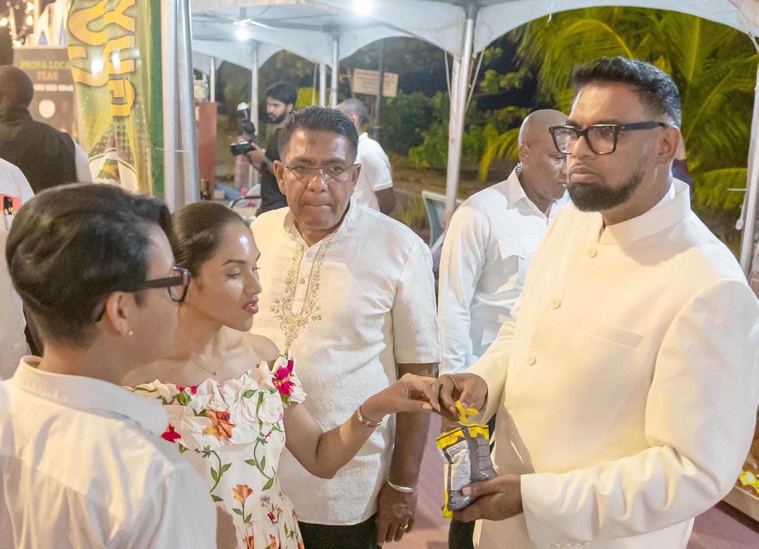 President Dr. Mohamed Irfaan Ali, the First Lady, Mrs. Arya Ali, enjoying a packet of tasty chips at the farmers’ market. Also pictured are Minister of Tourism and Culture Susan Rodrigues, and Minister of Agriculture Zulfikar Mustapha. At the event, which continues today, local farmers and agro-processors are displaying, selling and having a sampling exercise of fresh and organic products. The event is part of Agriculture Month activities (Delano Williams photo)
