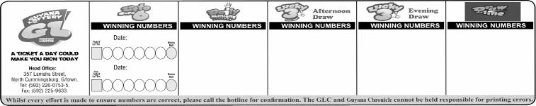 4 GUYANA CHRONICLE M onday, February 20, 2023 18/02/23 - 04, 19, 20, 22, 25 18/02/23- 3, 4 ,6, 7, 10, 13, 20 18/02/23 - 5 9 8 18/02/23 - 5 4 3 03 05 08 E Wednesday, February 18, 2023 11 14 17 15