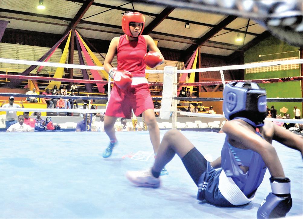 T&T’s Reyna John is floored by Guyana’s Angelica Rogers but recovered to win the most entertaining fight of the night (Sean Devers photo)