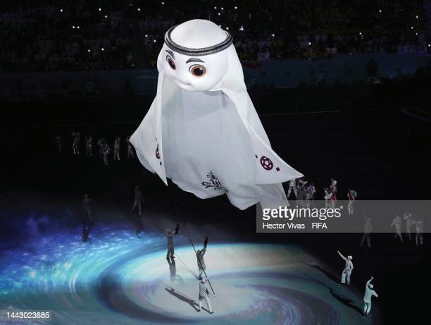 AL KHOR, QATAR - NOVEMBER 20: Qatar World Cup mascot La’eeb is seen during the opening ceremony prior to the FIFA World Cup Qatar 2022 Group A match between Qatar and Ecuador at Al Bayt Stadium on November 20, 2022 in Al Khor, Qatar. (Photo by Hector Vivas - FIFA/FIFA via Getty Images)