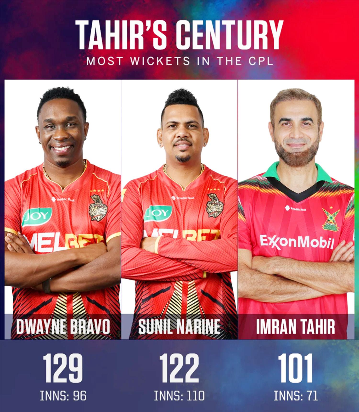 IN his seventh season - and second as captain - at Guyana Amazon Warriors, Imran Tahir, now the oldest player in the CPL at 45, became the first overseas bowler to take 100 wickets in the league.
