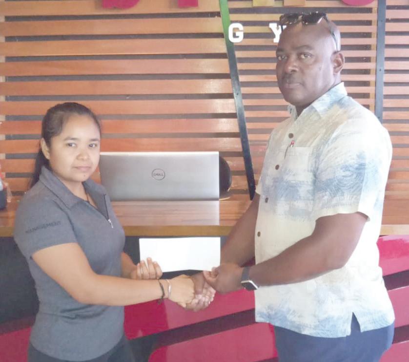 Space Gym Supervisor , Roann Pierre , hands over sponsorship to GAPLF head, Frankie Wilson yesterday