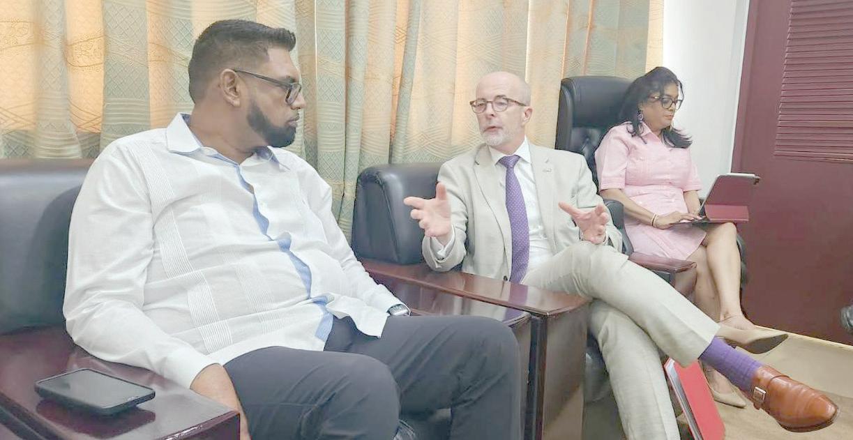 During the visit, Knott met with President Ali to discuss United Kingdom-Guyana relations, focusing on business proposals currently under consideration by the Government of Guyana.