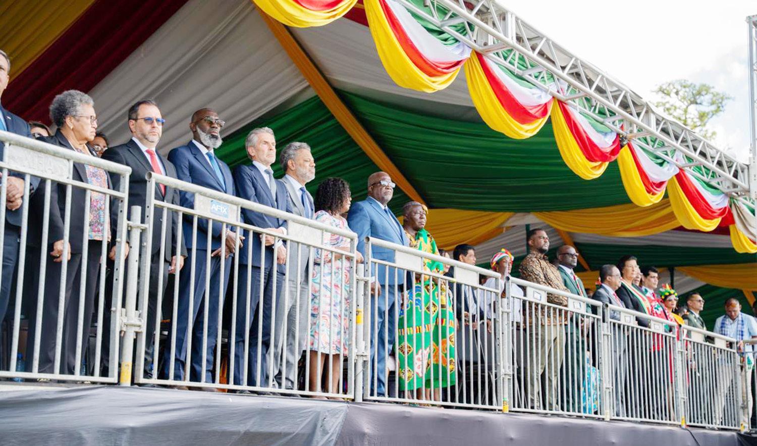 Prime Minister, Brigadier (Ret’d) Mark Phillips, on Tuesday, attended the Extraordinary Sitting of the National Assembly of the Republic of Suriname, held as part of the official programme marking the country’s 50th Independence Anniversary. Following the parliamentary proceedings, Prime Minister Phillips joined the President of Suriname, Jennifer Geerlings-Simons at Onafhankelijkheidsplein to witness the ceremonial Military Parade, which showcased the nation’s armed forces and symbols of national pride. The Prime Minister was accompanied by his wife, Mrs Mignon Bowen-Phillips, at the events (Office of the Prime Minister)