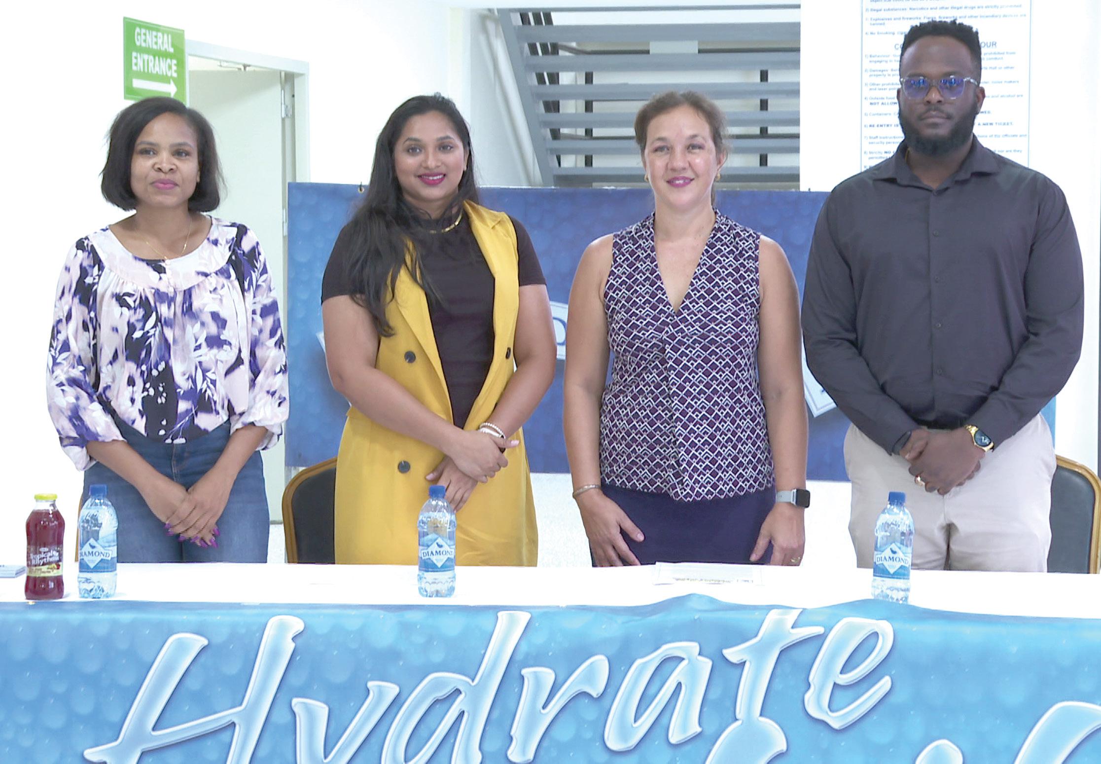 Guyana Hockey Board Committee member, Shaundel Grant, DDL brand executive, Raveena Mangal, Guyana hockey Board VP, Tricia Fiedtkou and Ansa McAl Business executive, Triston Freeman