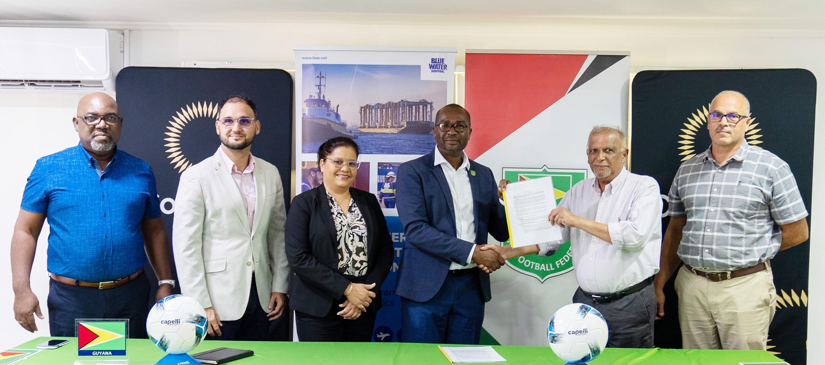 The signing of the contract was done at the GFF’s Secretariat in the presence of architect Tristan Gomes, Richard DeNobrega, Senior Vice-President of Sales & Development at Blue Water Shipping, and Rawlston Adams, Second Vice-President at the Guyana Football Federation.