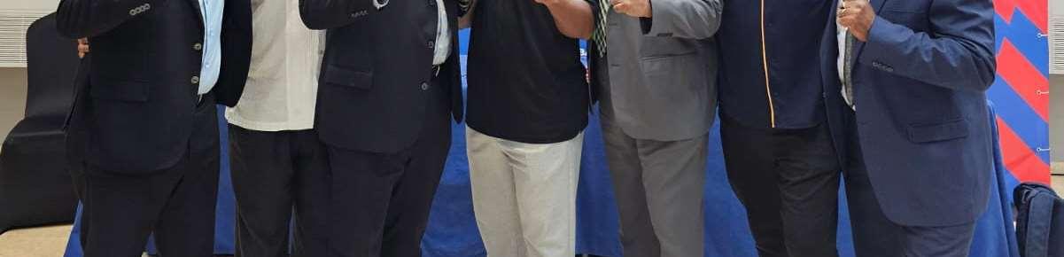 (Fromleft)GBAPresidentSteveNinvalleposesalongsidehis CaribbeancounterpartsVincentStraunoftheBahamas,Neil RobertsofGrenada,ShawnBlairofSt.Maarten,VicePresident JosephJoefieldofTrinidad,EdwinBassofCuracao,andDavid ChristopherofSt.LuciaaftertheconclusionoftheAmerica BoxingConfederation(AMBC)Forum