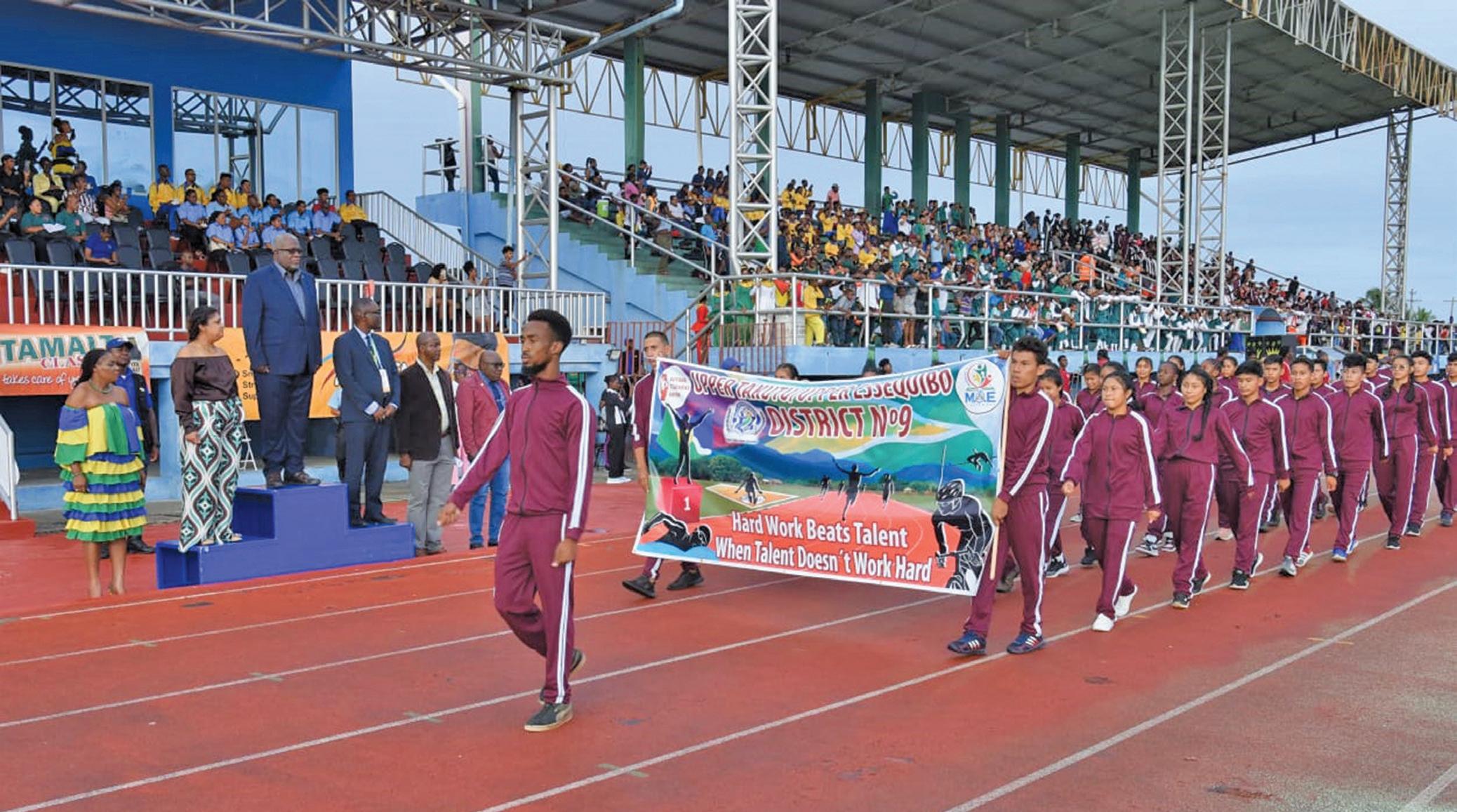 District 9 athletes march past the officials headed by Prime Minister (ret’d) Brigadier Mark Phillips and Minister of Education, Priya Manickchand. (DPI photos)
