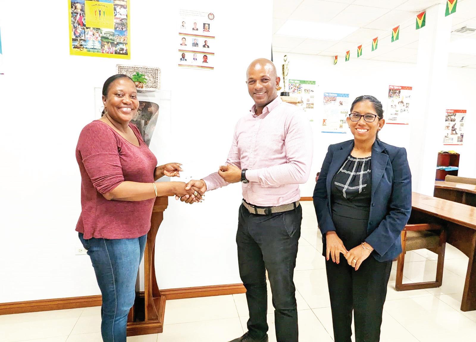 From left, Secretary of the GRFU, Petal Adams receives the cheque from Godfrey Munroe in the presence of GOA Secretary-General, Vidushi Persaud-McKinnon
