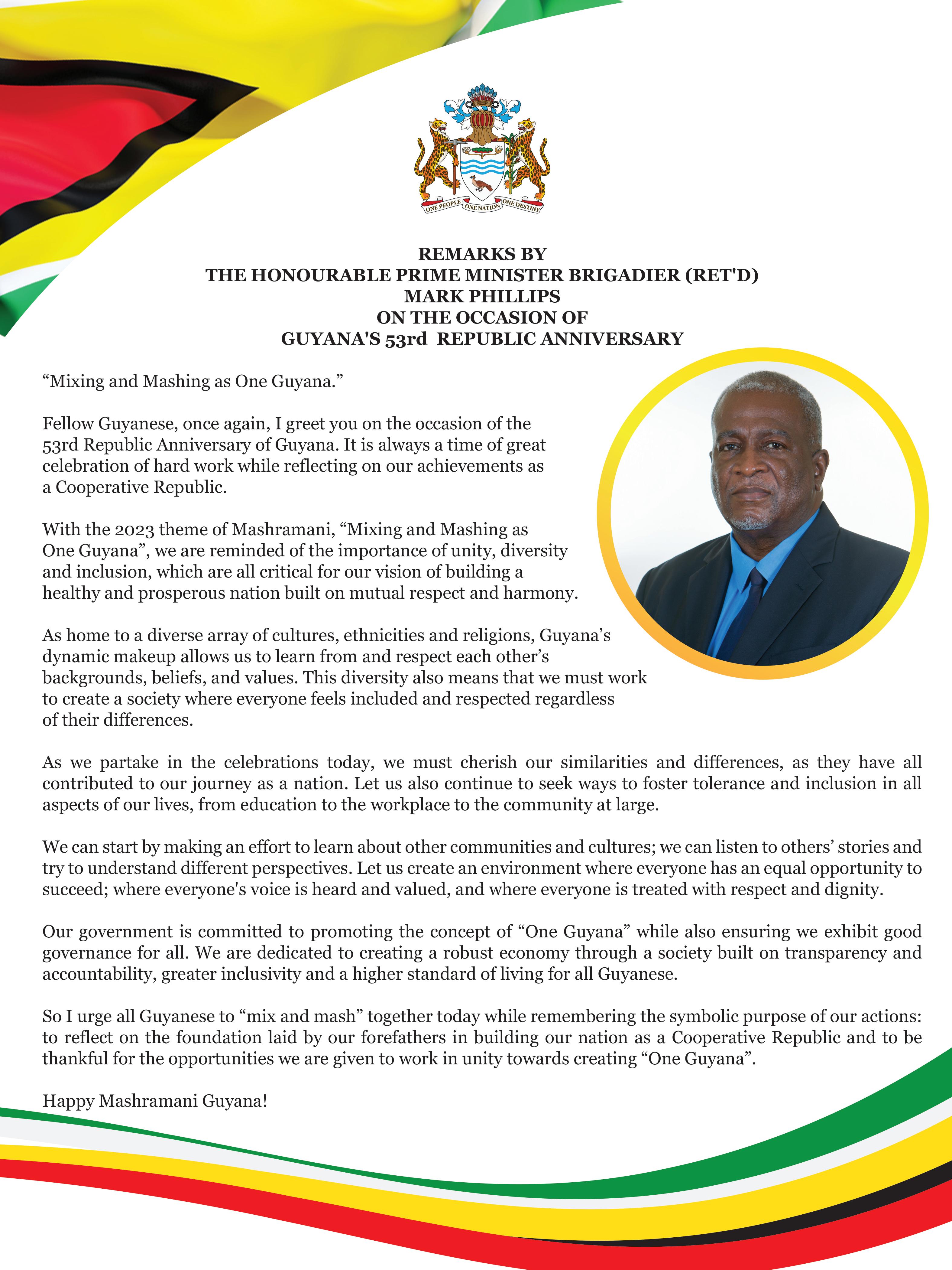 Fifty-three years ago, the attainment of Republican status heralded self-rule. As we reflect, let’s renew our commitment to collectively work towards building a Guyana we all desire and to strengthen the bonds of brotherhood and sisterhood. Let us work towards removing the barriers of division, recognising that we are stronger together, as we work to achieve the collective aim of “One Guyana.”