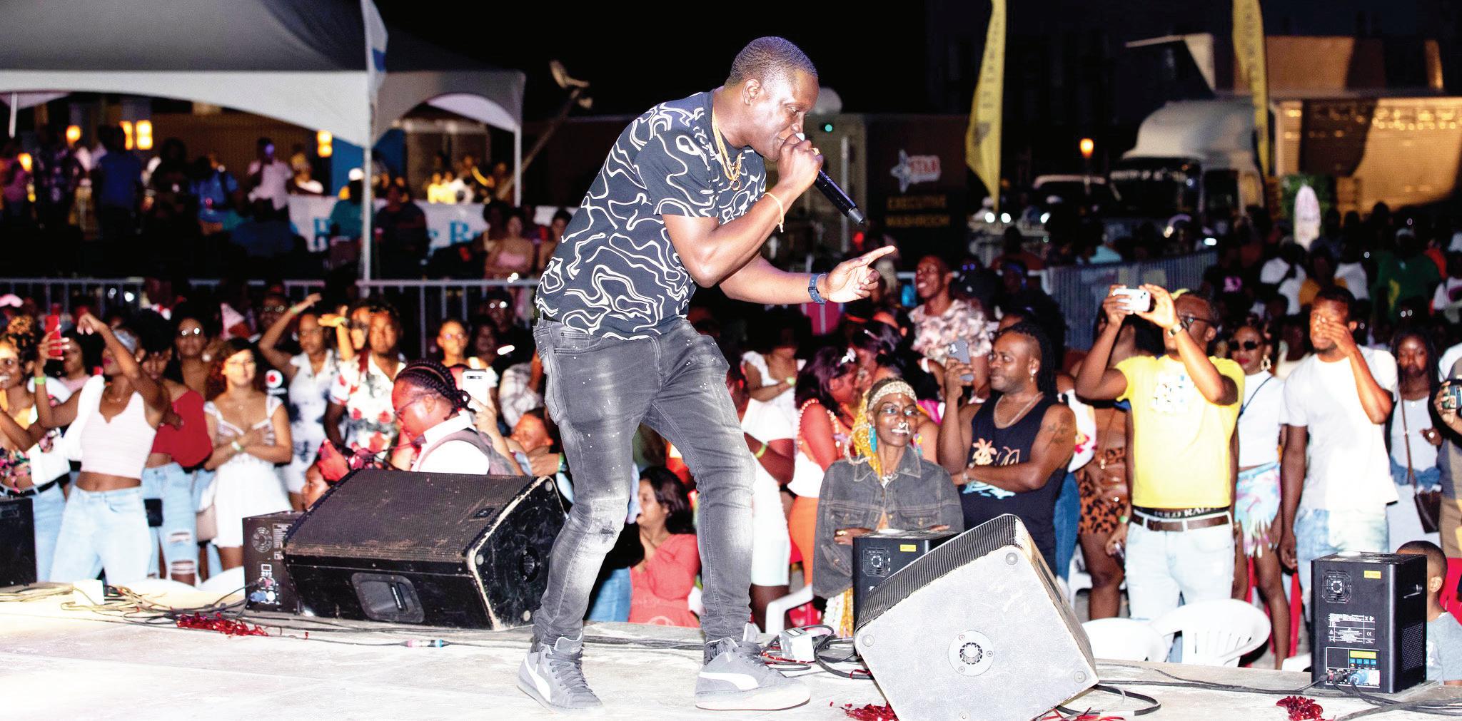 As Guyana returns to some normalcy after three years of battling the COVID-19 pandemic, patrons and entertainers alike were able to bask in the festivities that were held leading up to the grand ‘Mash’ road parade. In this photo captured by DPI, Guyanese singer and songwriter, Calvin Burnette, treats a crowd of patrons to an ecstatic performance
