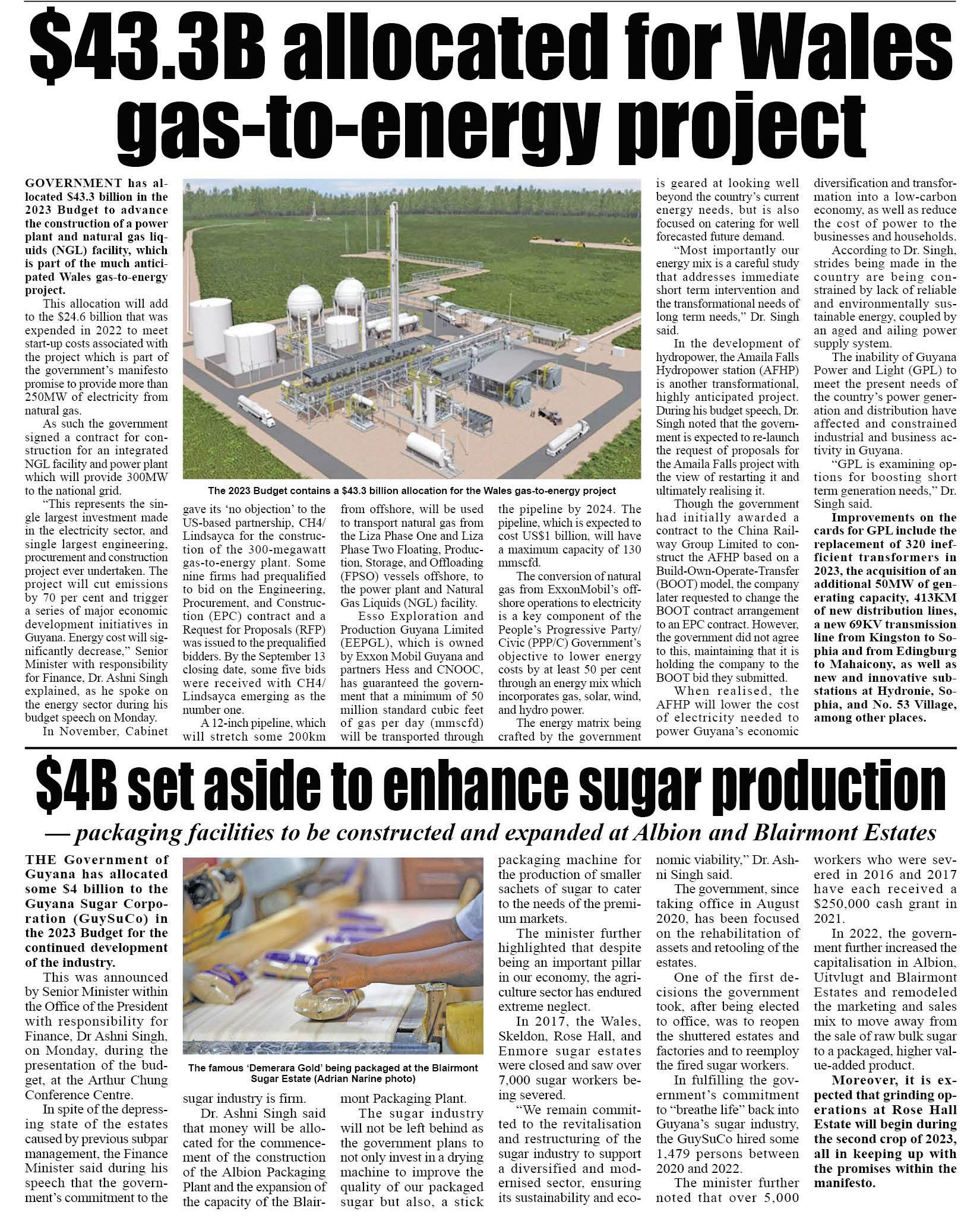 Minister Singh, in his presentation of the National Budget 2023, detailed there is an allocation of $43.4 billion to support the construction of a 300 megawatts (MW) Combined-cycle gas turbine power plant, natural gas liquids plant, and associated facilities.