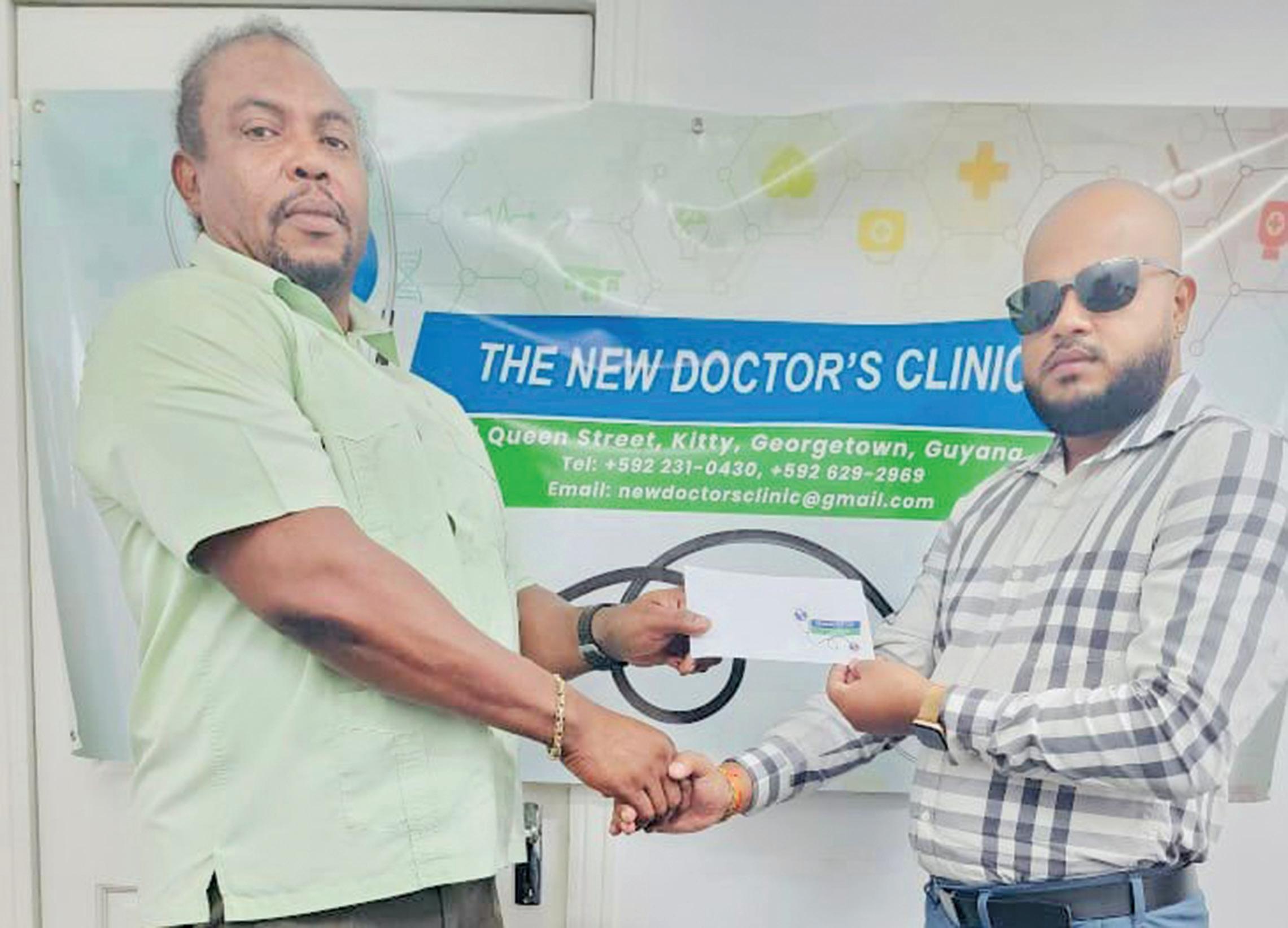 Managing Director of The New Doctor’s Clinic, Satyendra Khemraj (right), hands over a cheque to powerlifter Roger Rogers