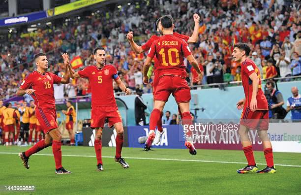 Marco Asensio of Spain celebrates with team mates after scoring during the FIFA World Cup Qatar 2022 Group E match against Costa Rica at Al Thumama Stadium yesterday in Doha, Qatar (Photo by Stu Forster/Getty Images)