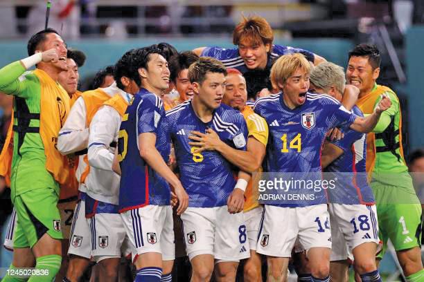 Japan's players celebrate scoring their first goal during the Qatar 2022 World Cup Group E football match against Germany at the Khalifa International Stadium in Doha yesterday (Photo by Adrian Dennis/AFP via Getty Images)