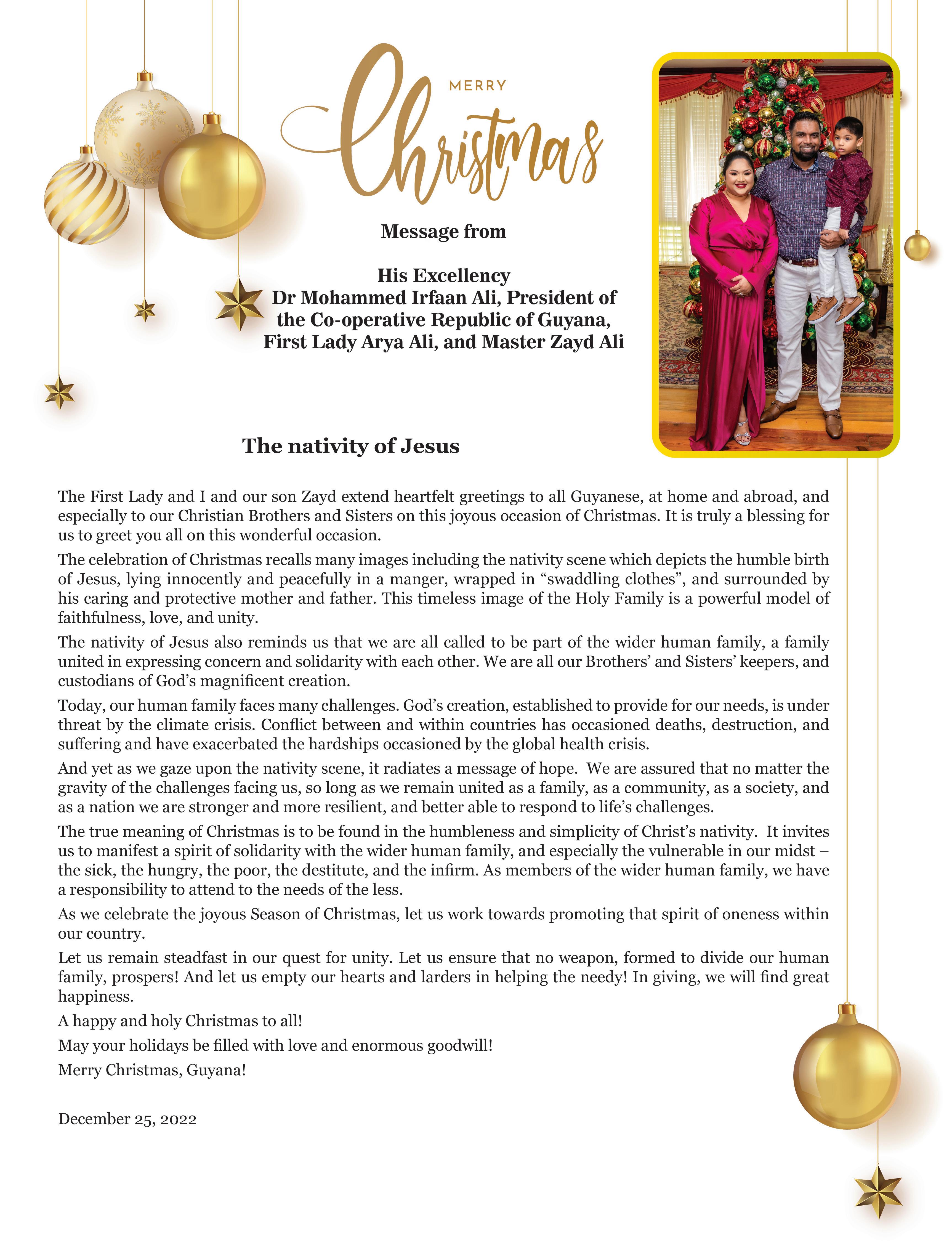 This year’s Christmas is particularly significant due to the convergence of a number of developments which has impacted positively on the national mood. This national mood was induced by the exemplary leadership of President, Dr. Mohamed Irfaan Ali, who has been working on overdrive mode to spread the message of love, care, compassion and hope among the Guyanese people.