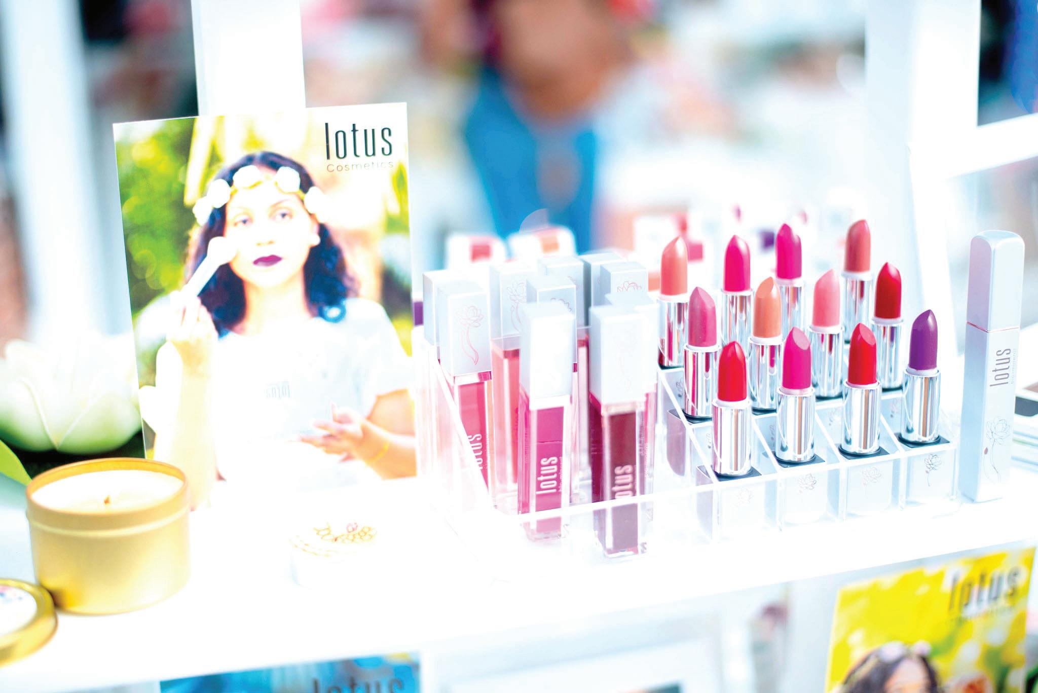 Lotus Cosmetics offers 10 shades of lipstick, 10 shades of lip-gloss, one volumi nous mascara, one eternal eyeshadow palette, and one forever face palette that has four shades of eyeshadow, one blush, one highlighter, and four powder foundations. The team is also working on creating a liquid foundation as well.