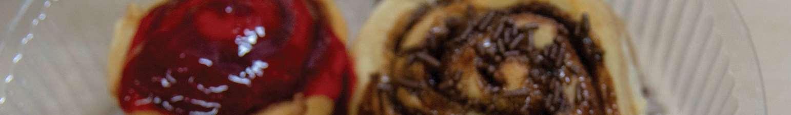 Shemakescinnamonrolls fromscratchwithtoppings likestrawberry,cookiesand cream,doublechocolate, whitechocolate,andcream cheese,alongwithsponge cakeandcheesecakewith strawberrytoppings.