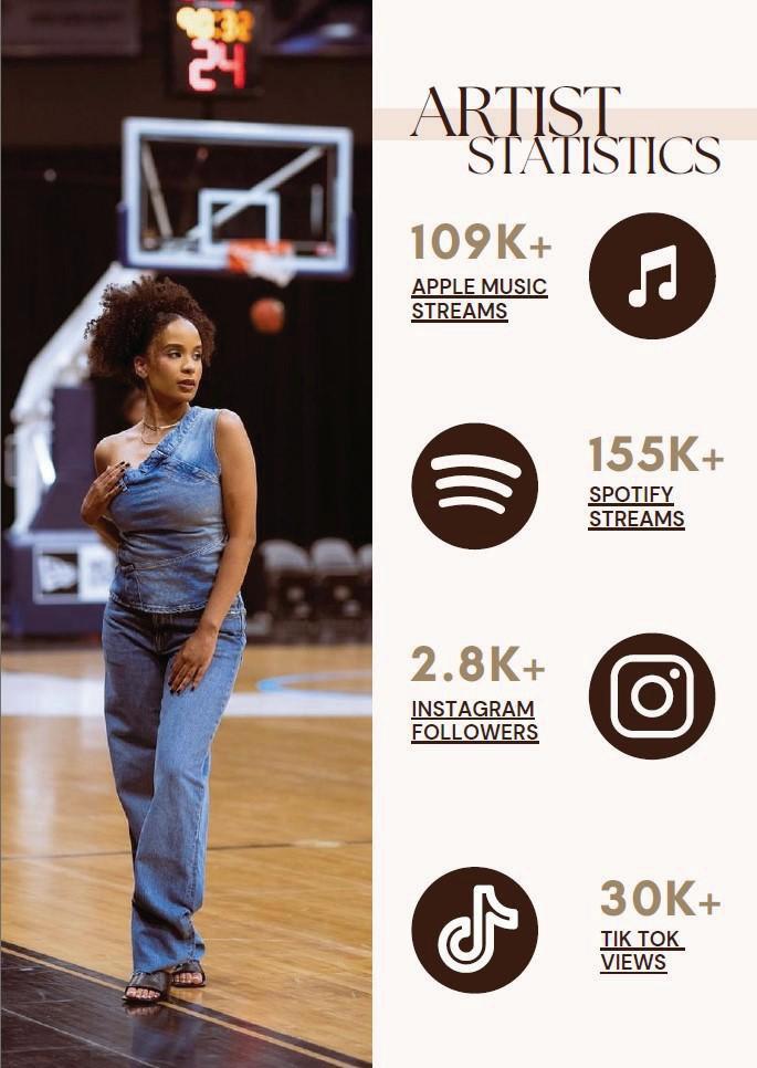 Her online statistics are as follows: 190K+ on Apple Music streams; Spotify Streams is 155k+; 2.8k+ on Instagram followers; and 30k+ on TikTok views.