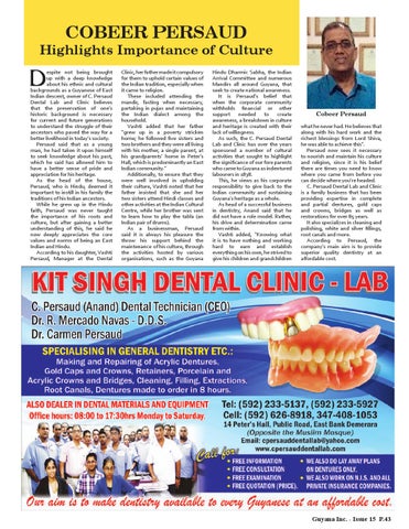 what he never had. He believes that along with his hard work and the richest blessings from Lord Shiva, he was able to achieve this”. Persaud now sees it necessary to nourish and maintain his culture and religion, since it is his belief there are times you need to know where you came from before you can decide where you’re headed. C. Persaud Dental Lab and Clinic is a family business that has been providing expertise in complete and partial dentures, gold caps and crowns, bridges as well as restorations for over 85 years. It also specializes in cleaning and polishing, white and silver fillings, root canals and more. According to Persaud, the company’s main aim is to provide superior quality dentistry at an affordable cost.