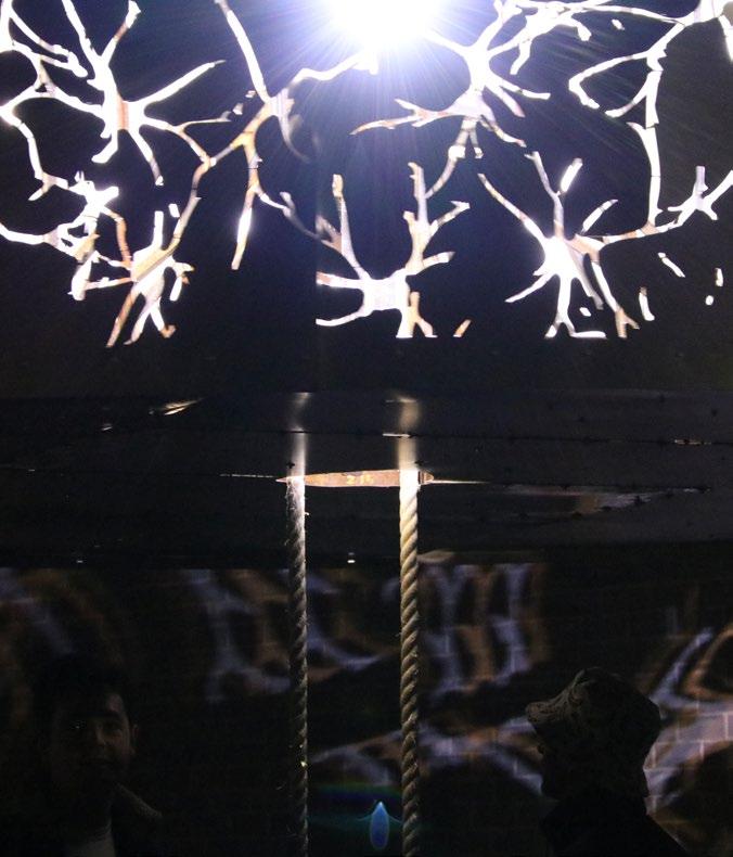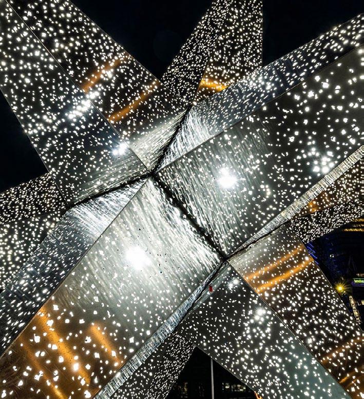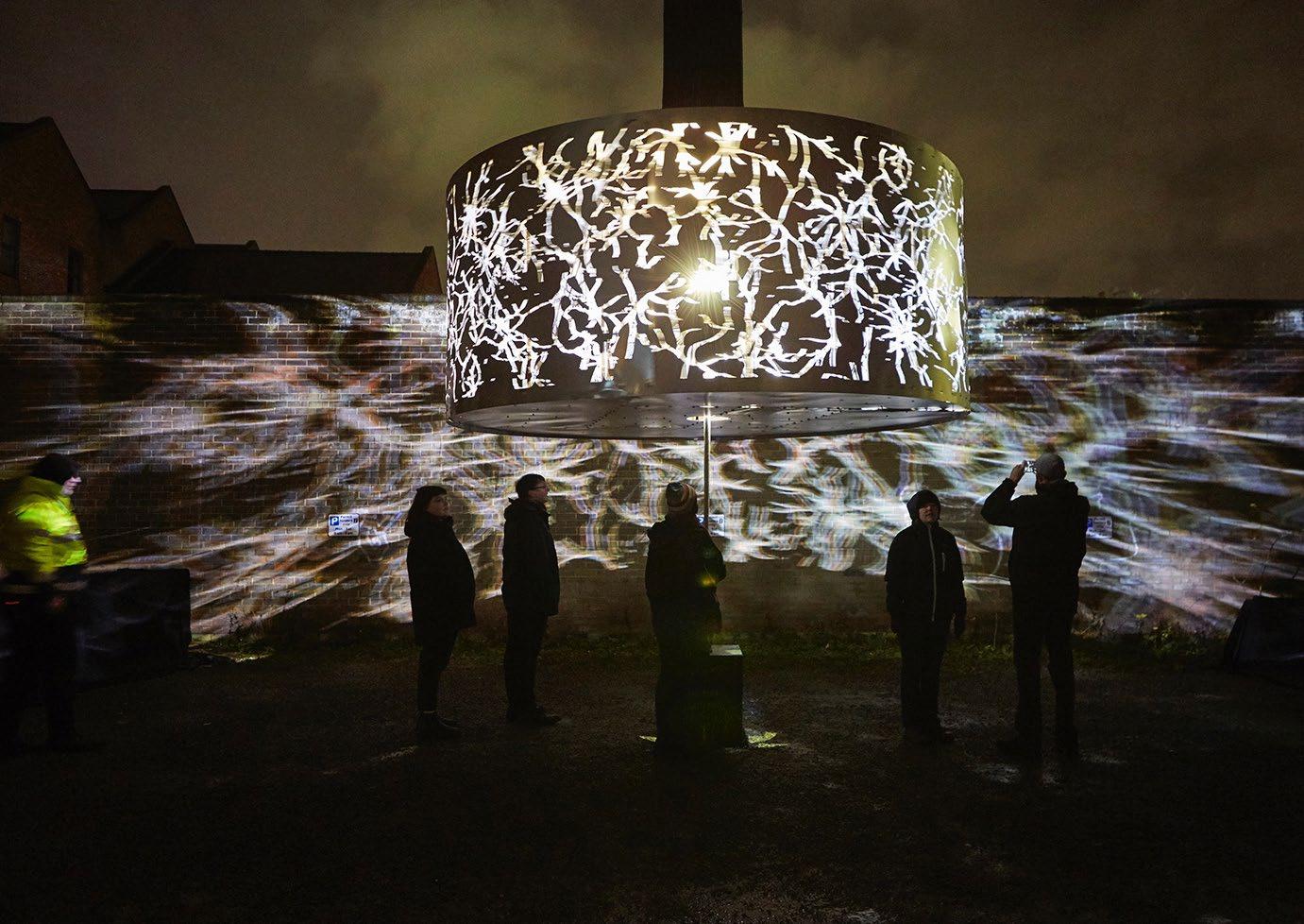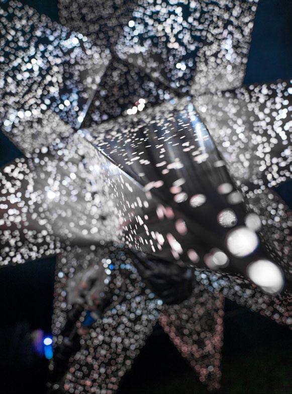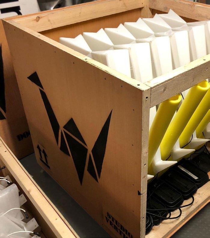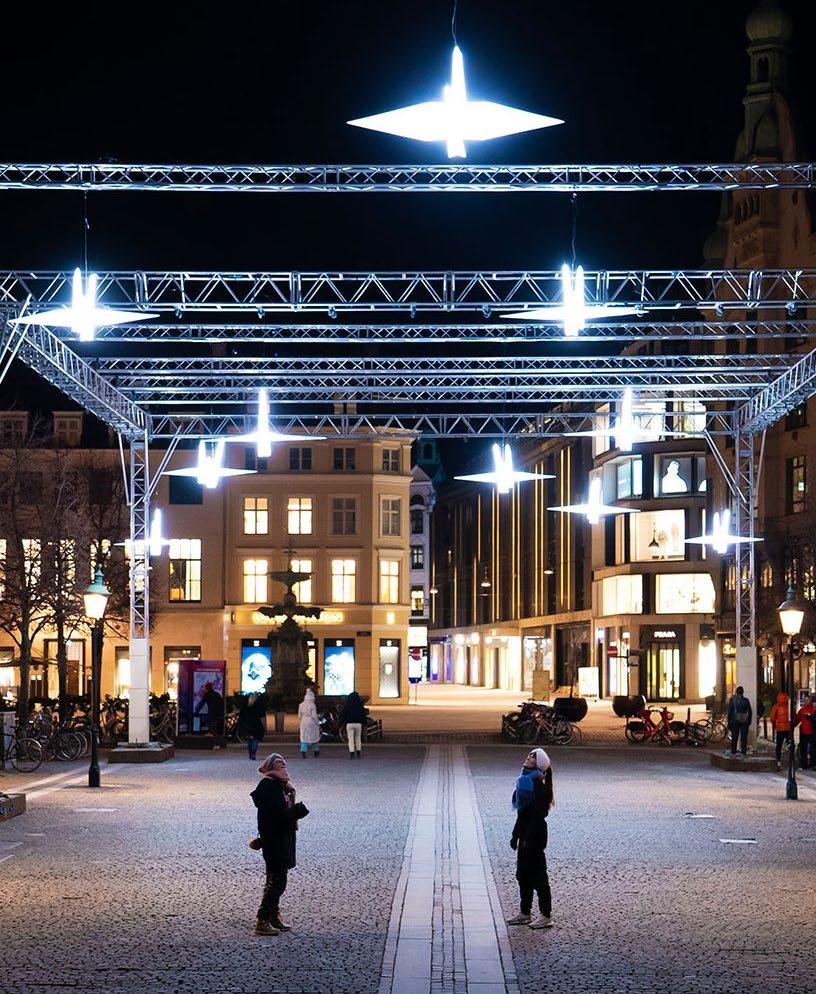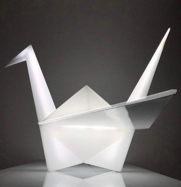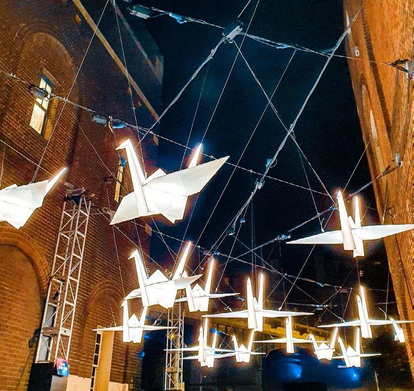 Seen swooping between buildings at several noteworthy light festivals this flock of 2 meter wide origami cranes makes people feel very small. Made out of polypropylene sheet CNC cut and welded together. Their flat pack design has allowed efficient transport around the globe.