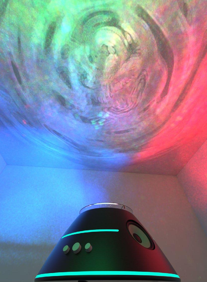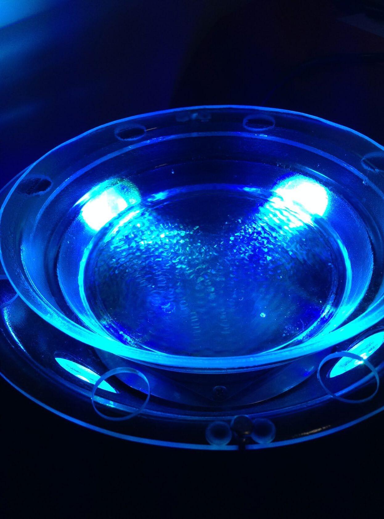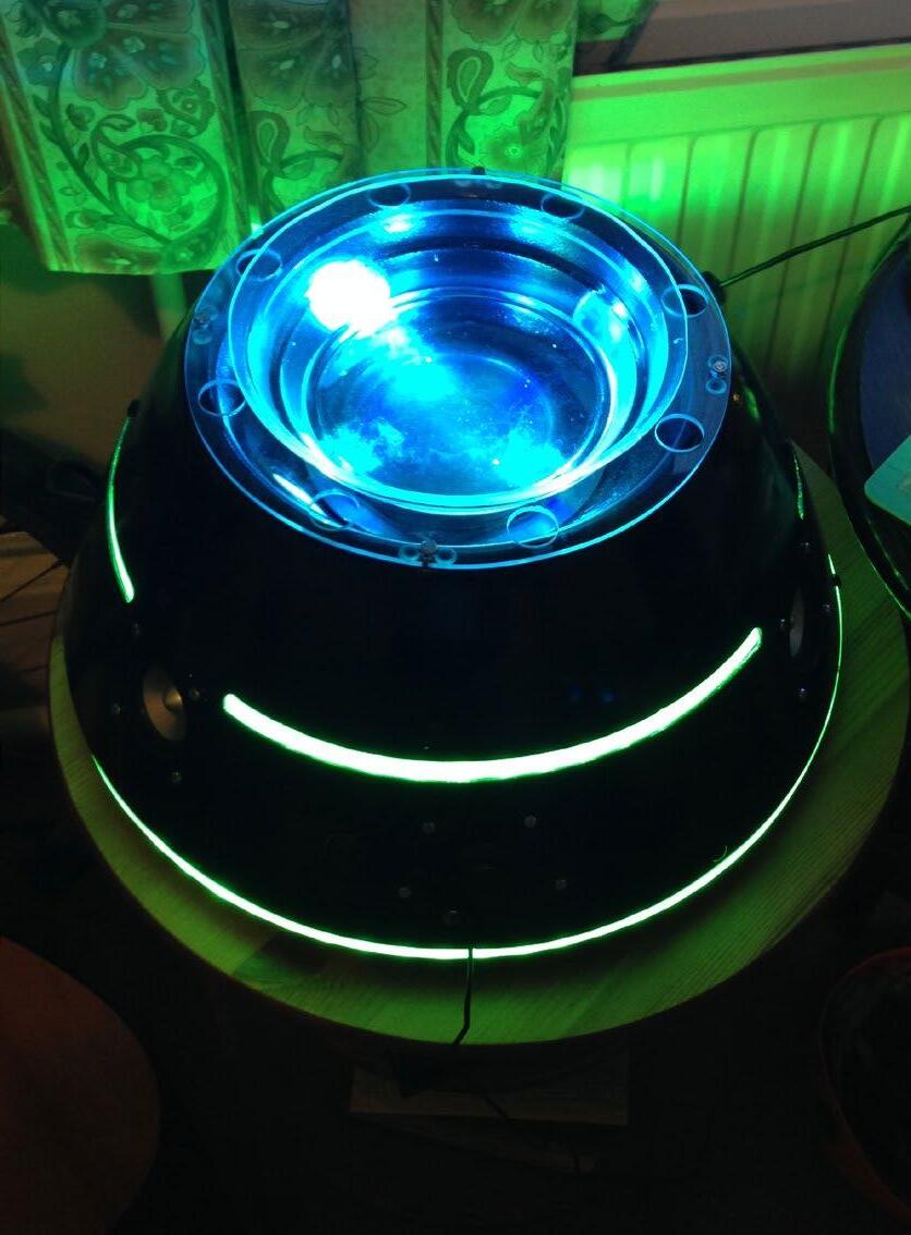I incorporated a water bowl and mood lighting into a speaker system. The water vibrates due to the speaker’s sound waves. The resulting pattern is then projected around the room by the mood lighting creating some amazing visual effects. This pattern changes and moves with the beat of the music as different frequencies effect the water in different ways. Led strips were added in rings to add to the lighting effects.