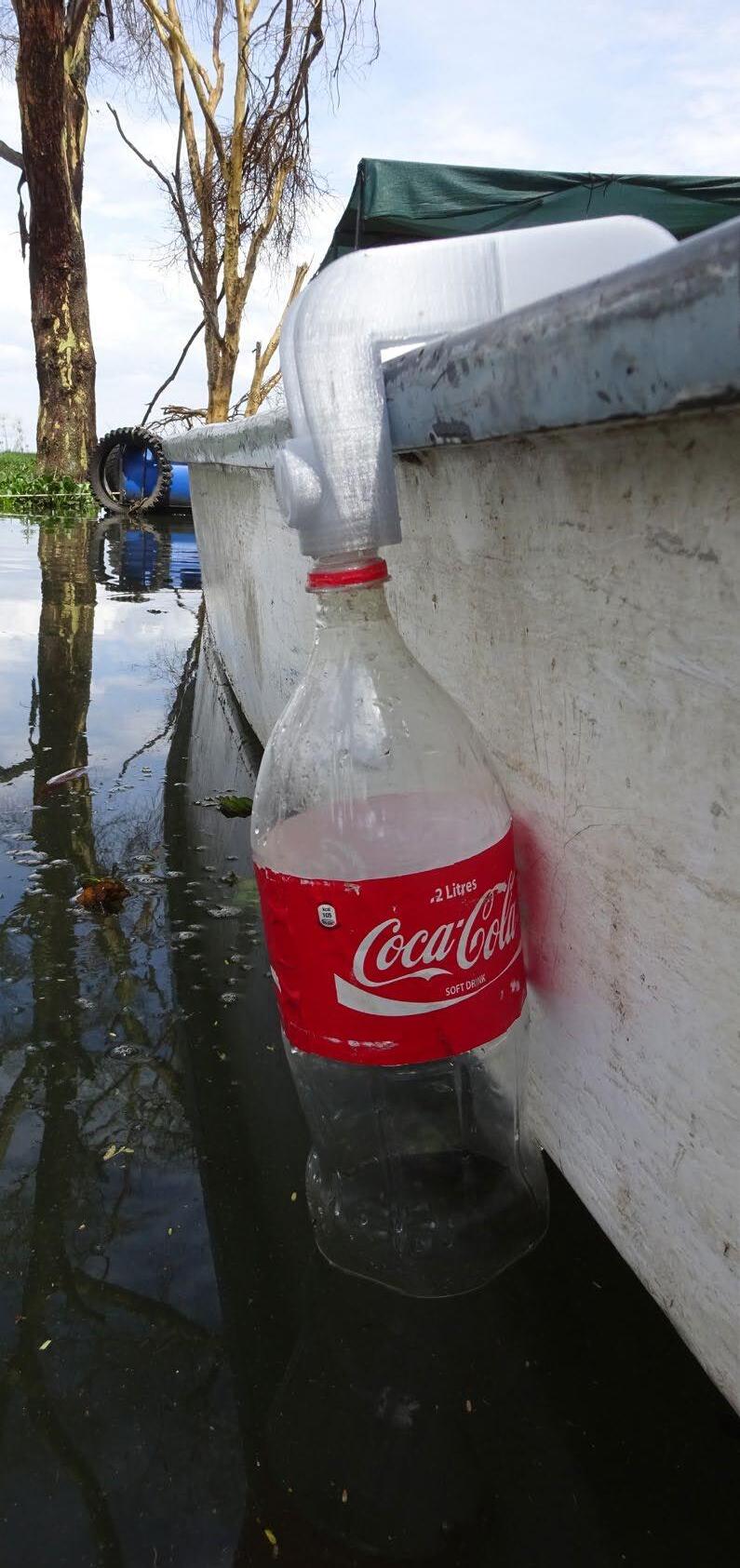 An evaporative cooling flask which incorporates a used 2l bottle to hold the milk. The flask has walls with a outer mesh and hollow cavity holding a wick. The user adds water to the wick to cool the milk up to 10 °C colder than the outside temperature. This brings milk cooling to the large numbers of dairy farmers without electricity.