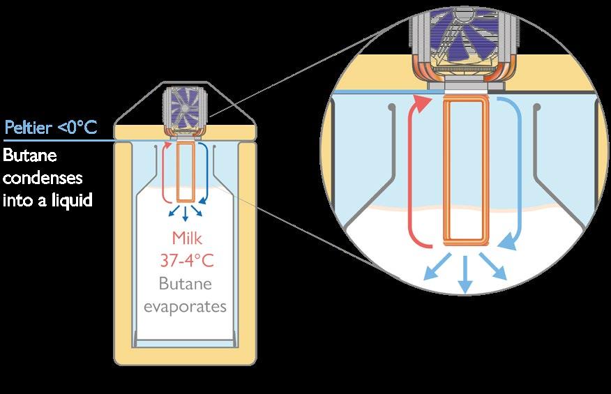 Butane changes from liquid to gas at -0.5°C making it a good phase change material to be used in a heat pipe to cool the milk directly.