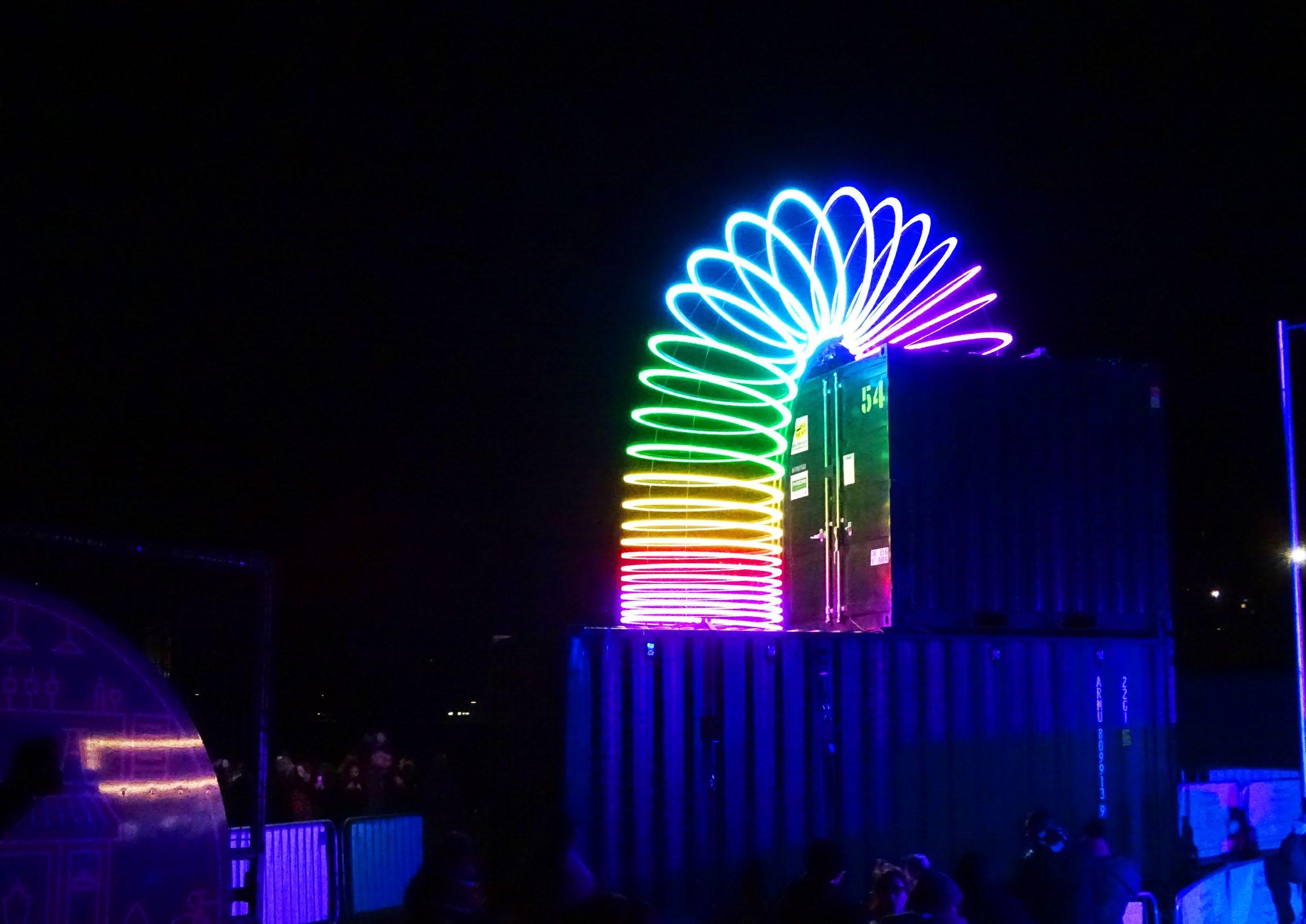 Each of the 28 rings making up the Slinky could be controlled intependently to make an array of visial patterns. We opted to program a pulsating rainbow down its length to give the the illusion of it falling down steps.