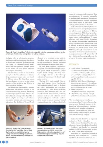 REFERENCES 1. World Health Organization, “Adherence to Long-Term Therapies – Evidence for Action,” 2003. (www. who.int/chp/knowledge/publications/ adherence_full_report.pdf, accessed on April 4, 2014.) 2. PhRMA, “2013 Report: Medicines in Development – Biologics”. (ww.phrma. org/sites/default/files/pdf/biologics2013. pdf, accessed on April 4, 2014.) 3. PhRMA slide pack “Biopharmaceuticals in Perspective”. 4. “Injectable Drug Delivery Through 2016,” Greystone Research Associates. * For investigational use only by our pharmaceutical and biotechnology development partners. West seeks partners for its SmartDose® injector technology platform. This platform is intended to be used as integrated systems with drug filling and final assembly completed by the pharmaceutical/biotechnology company. Daikyo Crystal Zenith® is a registered trademark of Daikyo Seiko, Ltd. Daikyo Crystal Zenith and FluroTec technologies are licensed from Daikyo Seiko, Ltd. ConfiDose® and FluroTec® are registered trademarks of West Pharmaceutical Services, Inc, in the US and other jurisdictions. SmartDose® is a registered trademark of Medimop Medical Projects Ltd., a subsidiary of West Pharmaceutical Services, Inc. Copyright © 2014 Frederick Furness Publishing Ltd
