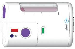 The user interface of Alby is designed for simplicity, as shown in Figure 2. Upon placing the injector on the body, there is only one visible button to start the delivery. There are three LED lights that provide the visual signals, each with a distinct purpose of informing users
