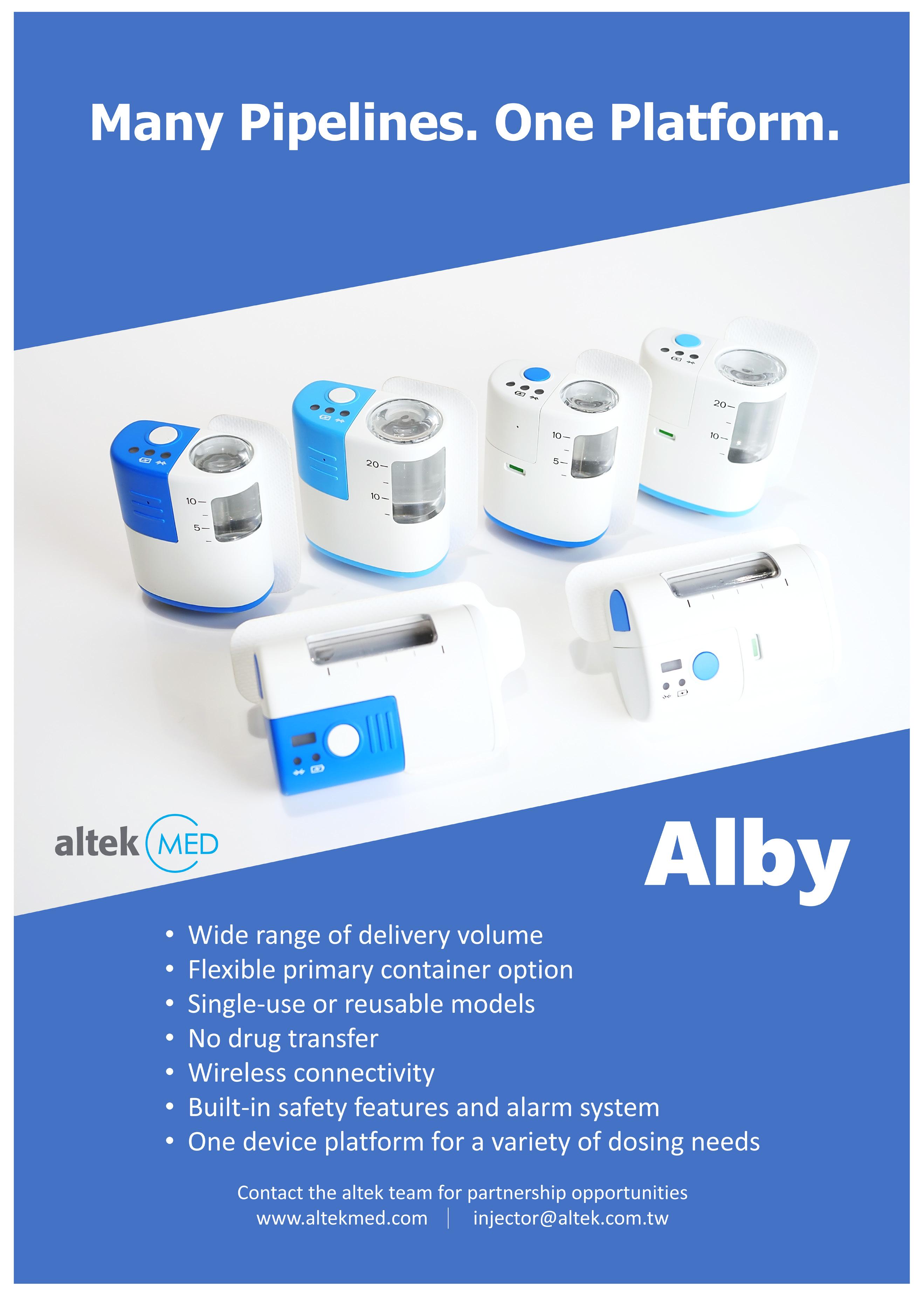 • Alby-S: A single-use, fully disposable device designed for long-acting drugs with low-dosing frequency (i.e. once every three months or longer), giving excellent usability and the fastest time to market.