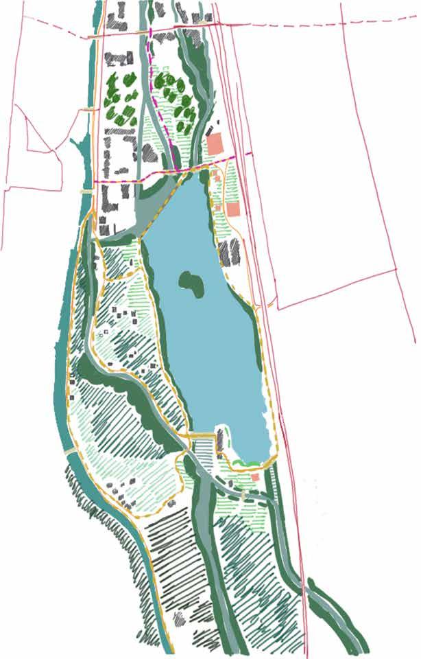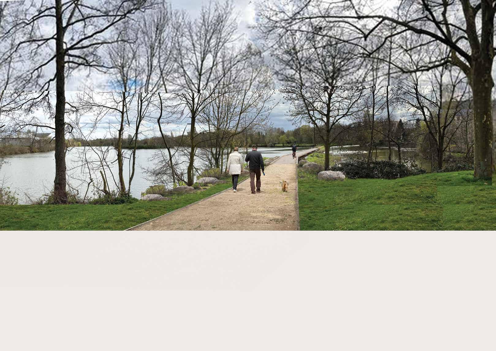 4/ Depuis la berge Nord devant le Cercle Pasteur, la proposition d’aménagement de la nouvelle digue permet aux promeneurs de traverser pour rejoindre la partie Sud du lac. Les rives du Loing offrent un intérêt botanique par des « sentiers nature(s) » à travers les boisements des rives, des berges et des prairies. Les zones humides ou zones tampons participent à la gestion des inondations et maintiennent l’équilibre des milieux naturels.