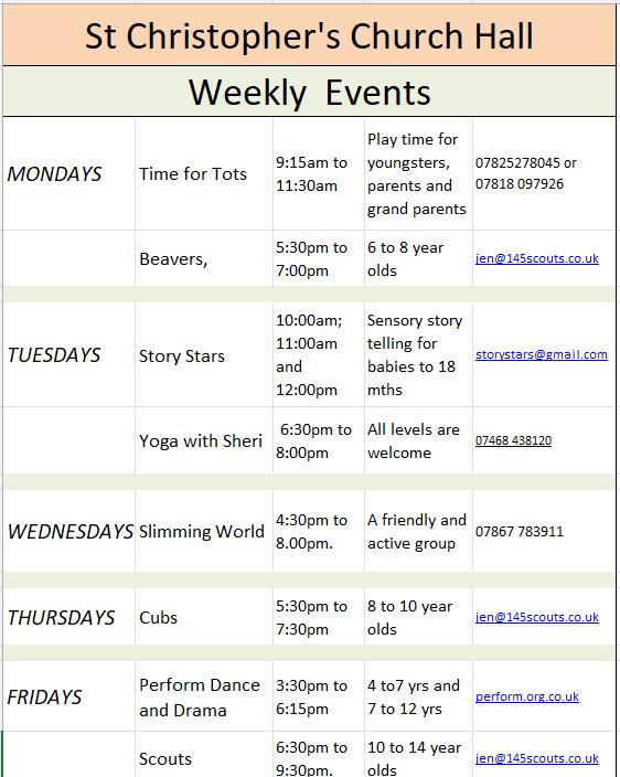 Beavers, Bingo, Brislington Carers Group, Brislington History Group, Brislington School of Dance, Bristol Concert Wind band, Broomhill Food Club, Brownies/Guides, Chair dance, Changes Support Group, Coffee morning, Craft & Hobbies Club, Creative Stitchers, Cubs, Flow Yoga, Gardeners’ Club, Hound plus Puppy Training, Karate, Keep Fit, Kick Boxing, Kung Fu, Line Dancing, Little Elephants, Little Treasures, Luncheon Club, Memory Café Alzheimers, Perform Dance and Drama, Pilates, Postnatal, Rainbows, Repair Café, Rockout Baby, Scouts, Slimming World, St Luke’s Players Drama, Story Stars, Taekwondo, Tai Chi, Time for Tots, Trefoil Guild, Zumba, Tea Club,