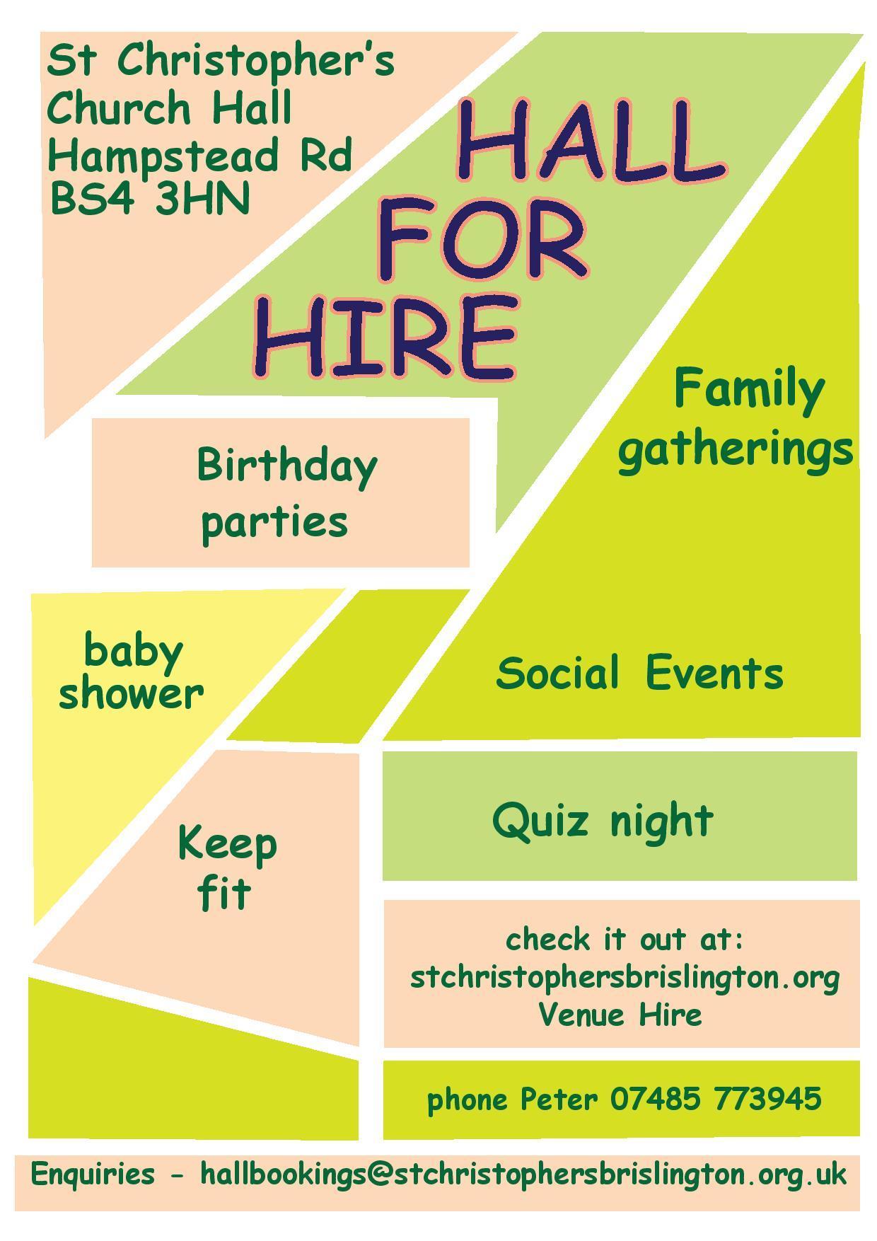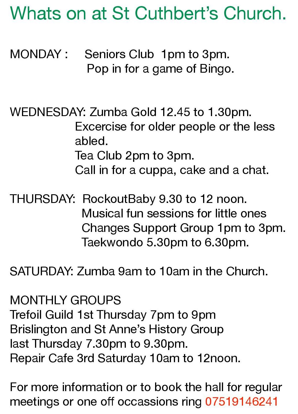 Beavers, Bingo, Brislington Carers Group, Brislington History Group, Brislington School of Dance, Bristol Concert Wind band, Broomhill Food Club, Brownies/Guides, Chair dance, Changes Support Group, Coffee morning, Craft & Hobbies Club, Creative Stitchers, Cubs, Flow Yoga, Gardeners’ Club, Hound plus Puppy Training, Karate, Keep Fit, Kick Boxing, Kung Fu, Line Dancing, Little Elephants, Little Treasures, Luncheon Club, Memory Café Alzheimers, Perform Dance and Drama, Pilates, Postnatal, Rainbows, Repair Café, Rockout Baby, Scouts, Slimming World, St Luke’s Players Drama, Story Stars, Taekwondo, Tai Chi, Time for Tots, Trefoil Guild, Zumba, Tea Club,