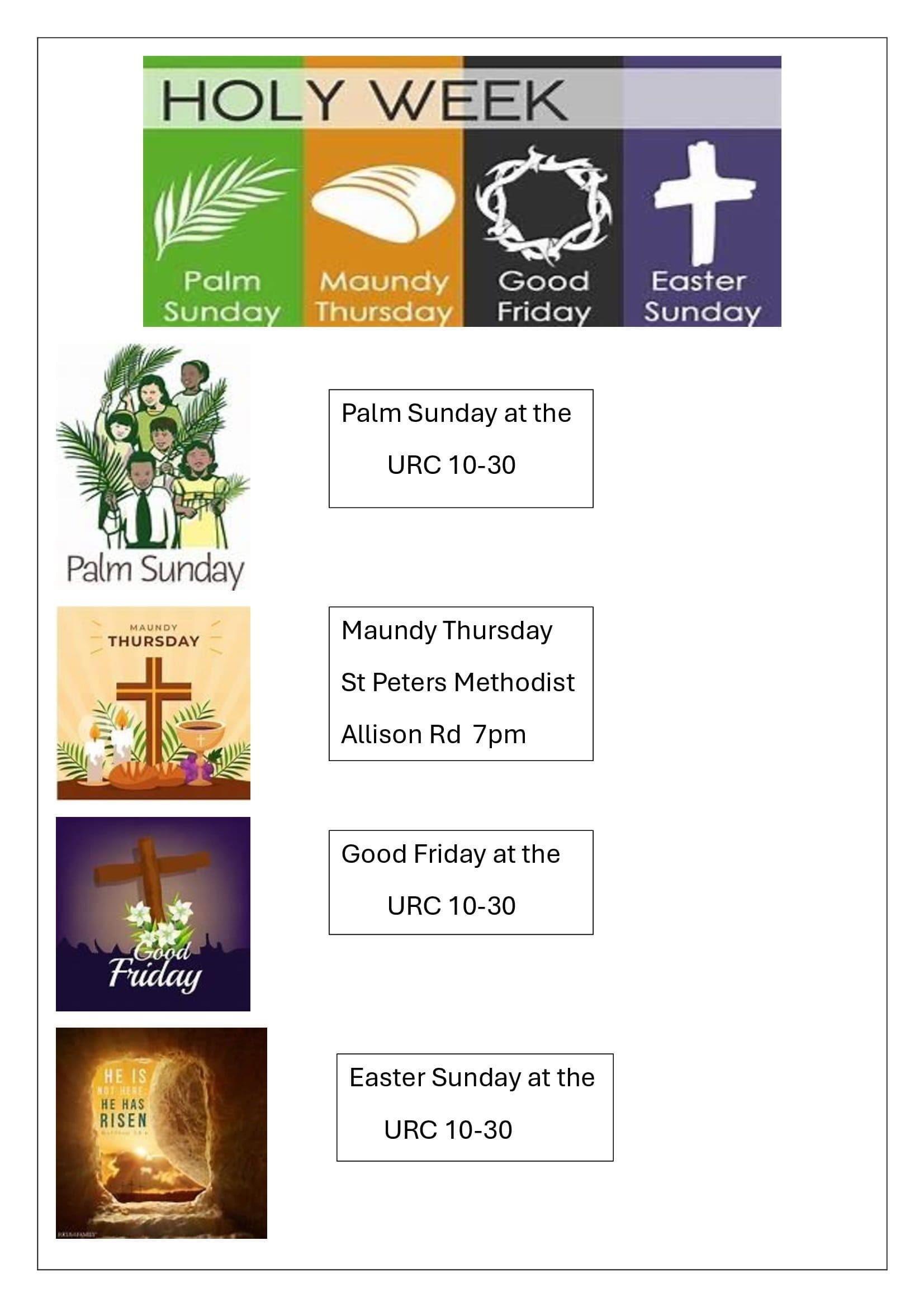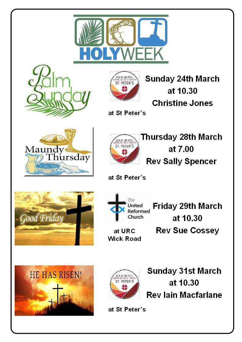 Thursday 7.30 pm Maundy Thursday Holy Communion at St Luke’s 7.00 pm Communion Service with URC church At St Peter’s
