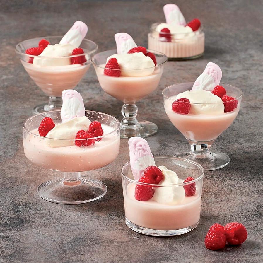Till garnering skumtomtar eller juleskum vispad grädde färska hallon