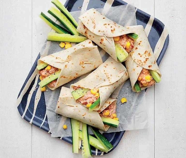 Komplett måltid i ett bröd – fyllt med tonfisk, majonnäs och majs. Blanda de härliga ingredienserna och rulla in tonfiskröran i bröden tillsammans med gurkstavar.